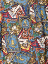 たくさんの洋書が敷き詰められたデザインが雰囲気のよい開襟ワンピース。紐ベルト付きで、ハリのある生地感です。