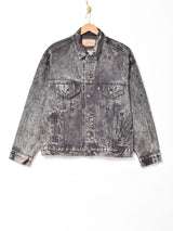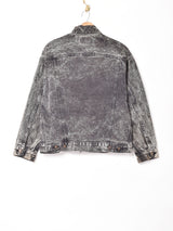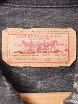 ケミカルウォッシュの風合いが魅力的な、リーバイスのブラックデニムジャケット。強めのコットンツイル生地がボリューミーなシルエットを描き、デザインとも相まって90年代らしい雰囲気を醸す一着です。