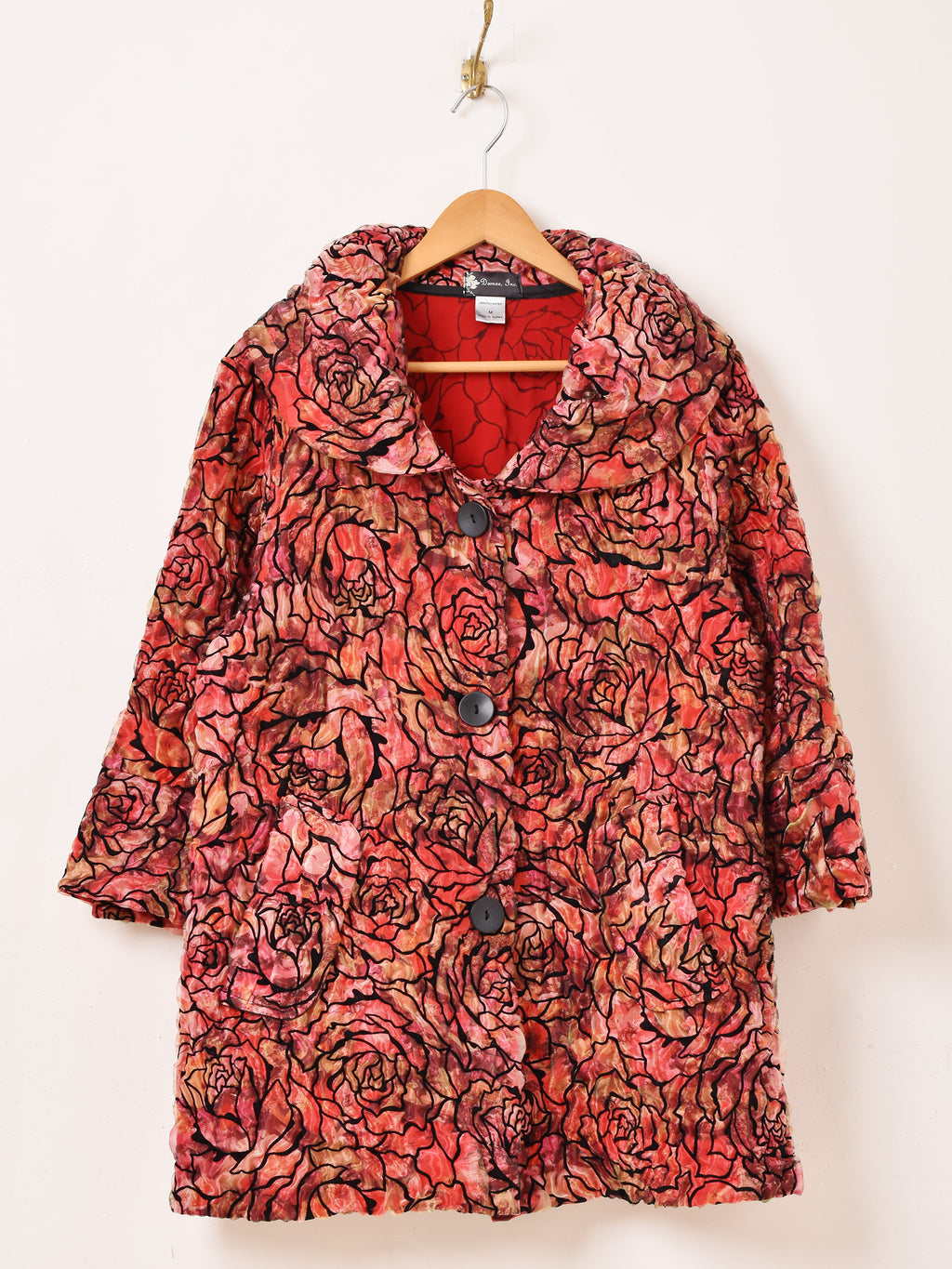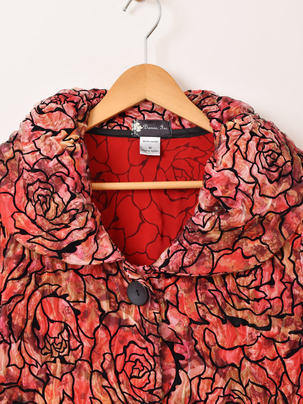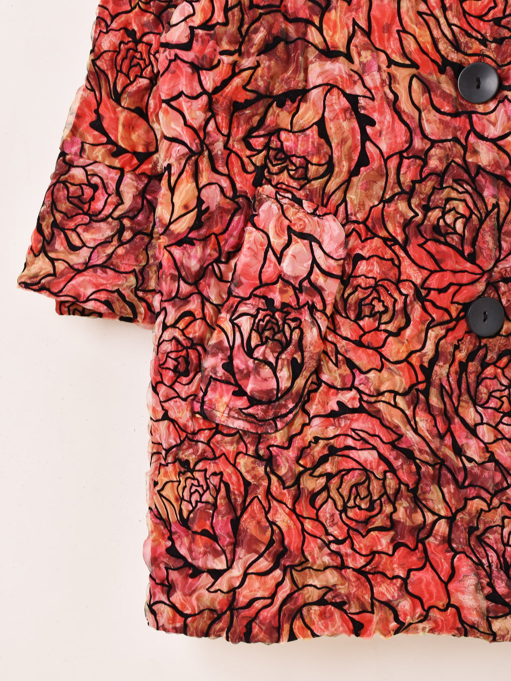 鮮やかなレッドやピンクのボディカラーが目を惹くジャケット。シースルー生地の上からバラの模様をあしらったデザインで、ゴージャスながらもどこか上品さの漂う一着です。大きめの丸い襟もポイント。