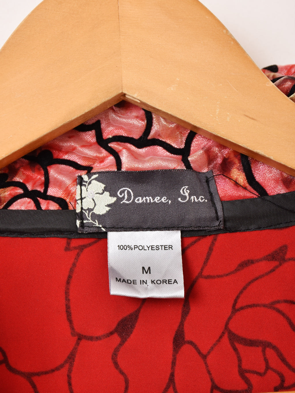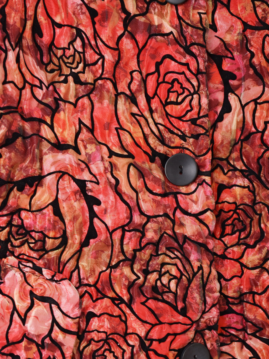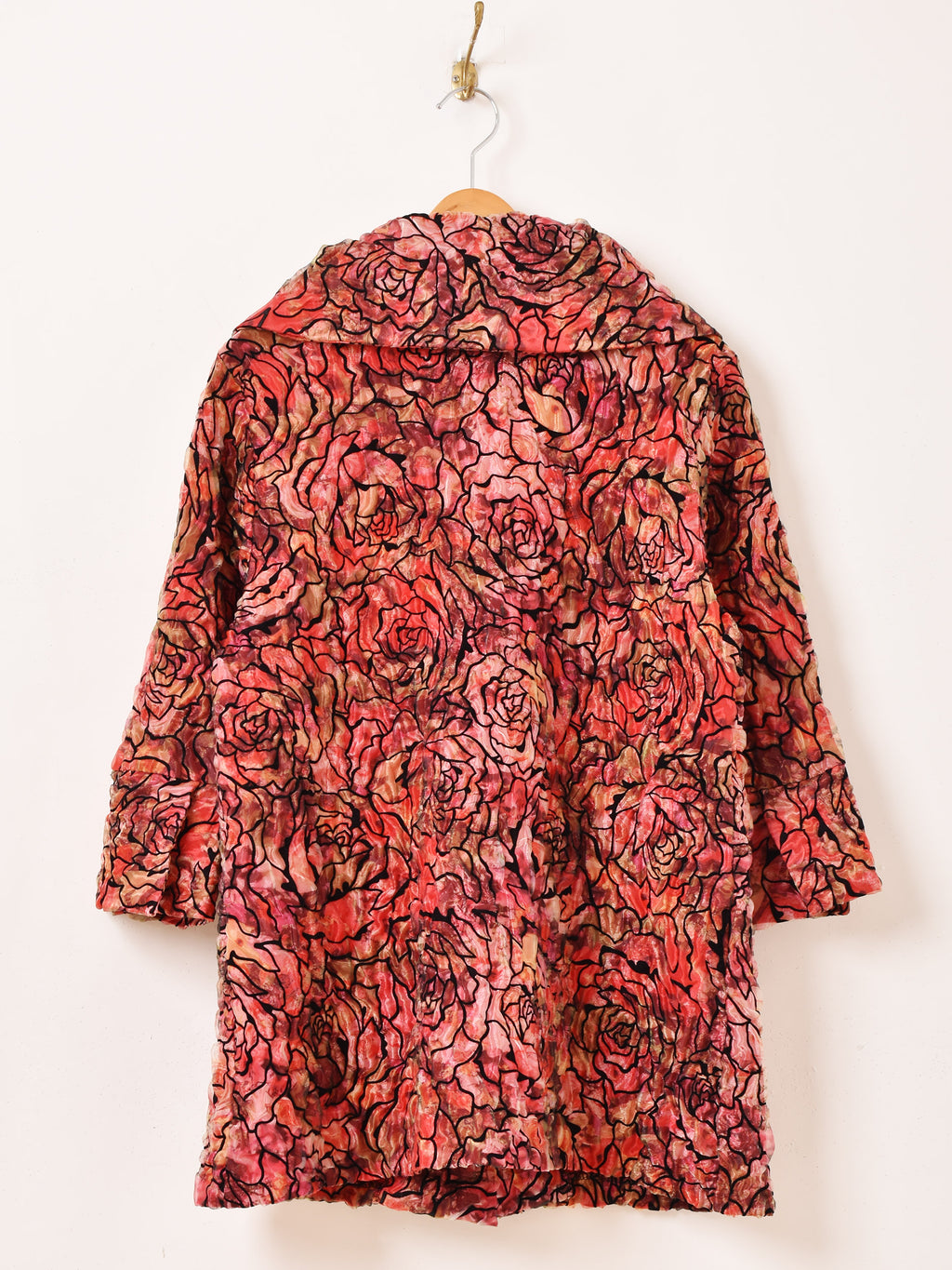 鮮やかなレッドやピンクのボディカラーが目を惹くジャケット。シースルー生地の上からバラの模様をあしらったデザインで、ゴージャスながらもどこか上品さの漂う一着です。大きめの丸い襟もポイント。