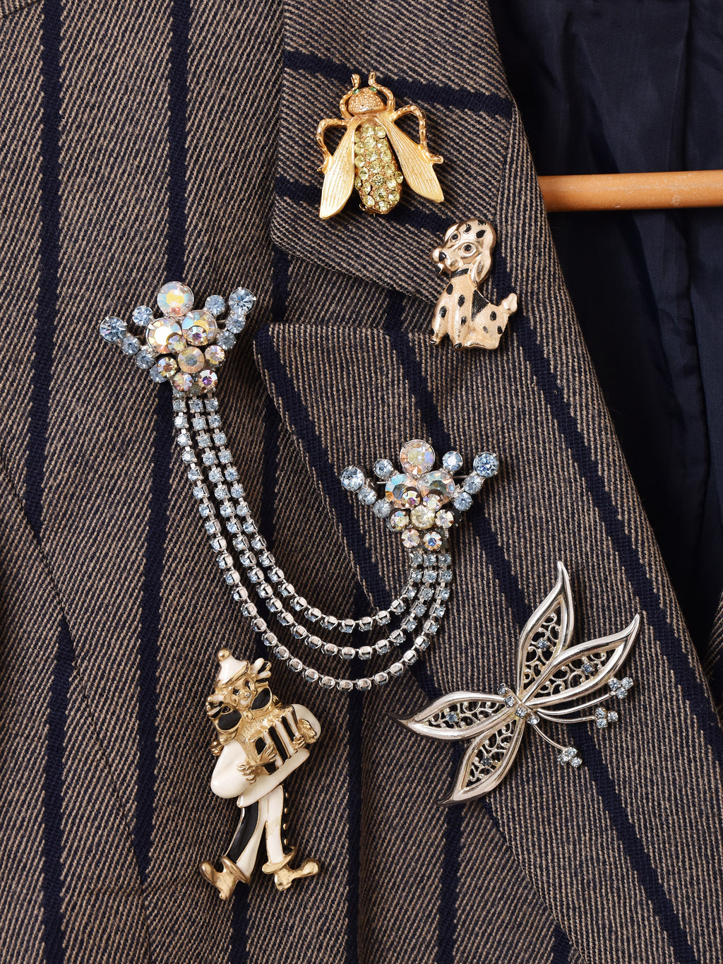 襟元にアンティークなブローチをあしらったブレザー。クロップド丈でトレンド感のある着こなしに。キラキラと輝くブローチがアクセントになり、華やかなスタイリングに仕上がるので、ドレスアップにもおすすめの一着です。