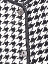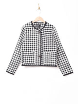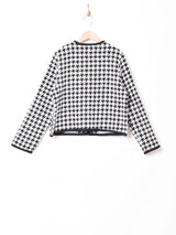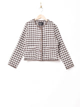 大きめの格子柄が可愛らしい一枚。パイピングがアクセントになります。しっかりとした厚みのある素材感で一枚でもあたたかいです。