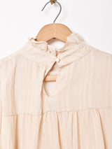 全体に緩くふんわりとしたティアードのワンピース。付属のリボンでキュッとウエストマークが出来ます。裏地付きでさらりと着れるアイテム。