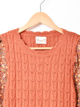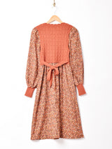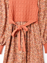 ニットと花柄のコーデュロイ生地がほっこりマッチした長袖ワンピース。アクリルニット生地は伸縮性があり、身頃のみタイトなデザインです。