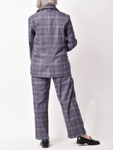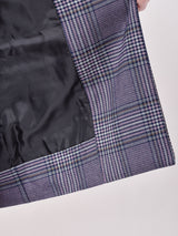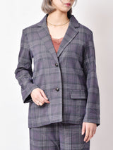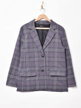 パープルを基調にブラウン×ホワイトの柄をあしらったテーラードジャケット。ポリエステル素材の裏地が付き、シーズンを通して活躍しそうな一着です。こちらセットアップ対応のアイテムで、別売りで同生地のパンツもございます。