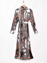 ブラックをベースにペイズリー柄が大きくプリントされたシックな雰囲気のワンピース。全体に入ったプリーツデザインが特徴的です。共布のリボンが付いておりウエストにベルトとして巻くとバランスよく着こなせます。