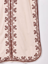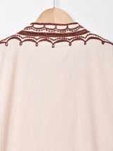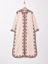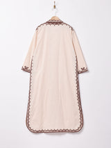 贅沢に刺繍が施されたヴィンテージライクなドレス。ワンピースとして一枚ではもちろん、フロントを開けガウンの様に着てレイヤードを楽しむのもおすすめ。ハリのある薄手のコットン素材です。