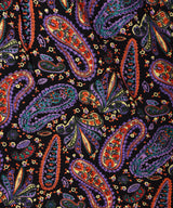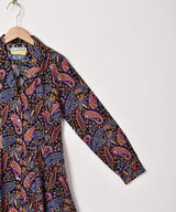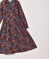 ブラックをベースにカラフルなペイズリー柄が映えるワンピース。胸元の開きが大人っぽさをプラスするオープンカラーデザイン。ハリがあり程よい厚みのコットン素材です。