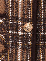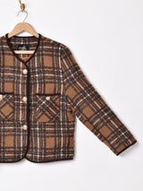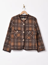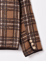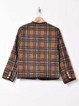 どんなアイテムとも相性のよい落ち着いたカラーが魅力のノーカラージャケット。光沢のある素材が編みこまれておりキラリと光るタータンチェックがよい雰囲気。存在感のあるゴールドのボタンもアクセントに◎程よく厚みのあるしっかりとした生地感で、裏地付きです。