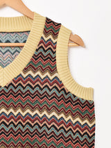 個性的な模様が目を惹くベスト。カジュアルな雰囲気のざっくり被れるプルオーバータイプ。やや厚みのあるしなやかな生地で、シーズン問わず着用できる一枚です。