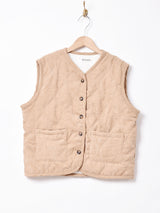 馴染みやすいカラーのキルティング生地がほっこりあたたかな印象の中綿ベスト。内側はフリース生地でふんわりとしています。