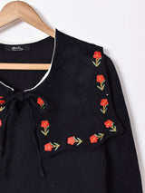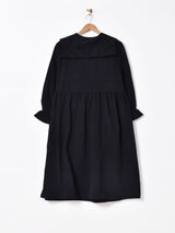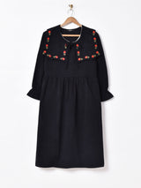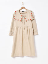 セーラーカラーの様な大きい襟がインパクトのあるワンピース。花の刺繍とキャンディースリーブもポイント。うっすら起毛したやや厚みのある生地です。