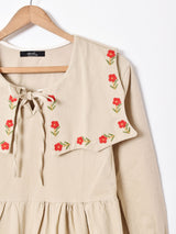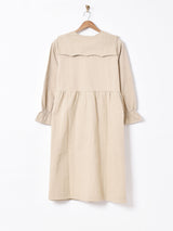セーラーカラーの様な大きい襟がインパクトのあるワンピース。花の刺繍とキャンディースリーブもポイント。うっすら起毛したやや厚みのある生地です。