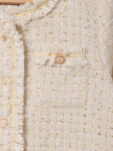ふわふわのフリンジをあしらった上品なツイードジャケット。ゴールドのラメ糸とデザインボタンが華やかさを添えます。さらっとした裏地付きで、厚みのあるしっかりとした生地です。
