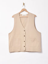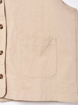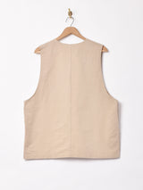 ゆとりのあるシルエットとシンプルなデザインがレイヤードしやすいベスト。ハリがありしっかりとしたコットンツイル生地です。