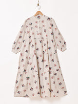 キナリ生地にチロル柄が可愛いらしい長袖ワンピース。ボリューミーなシルエットにコットンリネンの風合いがマッチして雰囲気のよい一着です。