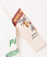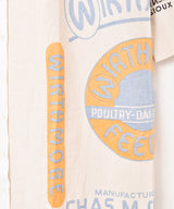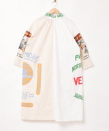 ズタ袋のパッケージをイメージしたプリントがポイントになったワンピース。異なる生地をドッキングしたクラフト感溢れるデザインが魅力。ハリのある薄手なコットン生地です。