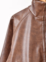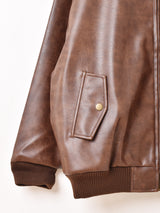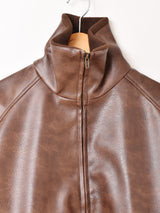 襟と袖口、裾がリブ仕様になった、フェイクレザーのブルゾンジャケット。裏地付きで程よい厚みがあり、クールにガバッと羽織れるサイズ感です。
