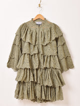 レースをたっぷりと使い、袖から裾にかけてフリルを段々に重ねた、ガーリーな膝丈ワンピース。首元はクラシックな雰囲気のスタンドカラー。裏地はなく、ほんのりとした透け感があります。
