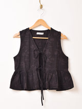 オリエンタルな織り柄生地を使用した、前開きリボン留めのベスト。裾が広がったペプラムシルエットなので体型カバーが叶えられます。