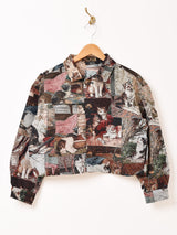 可愛らしい猫ちゃんたちの模様が目を惹くタペストリージャケット。アンティークな雰囲気抜群の一着です。クロップド丈でスタイルアップ効果が期待できそう。