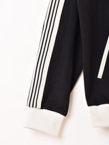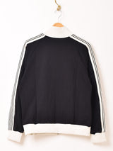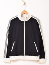 定番のライン入りデザインとブラック×ホワイトの配色で、使い勝手の良いジョグトップ。マットな質感のポリエステル素材です。男女兼用で着用できる3サイズ展開でご用意しました。
