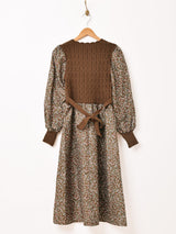 花柄の生地とニット地をドッキングした長袖ワンピース。スカラップネックやパフスリーブなど、ドレッシーなデザインを取り入れた女性らしいシルエットが魅力です。ニット生地のウエストベルト紐付き。