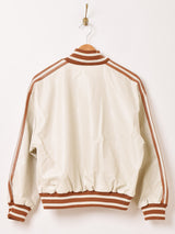 リブと袖のテープラインがアクセントになったブルゾンジャケット。柔らかいフェイクレザー生地で、程よい艶感があります。裏地付きです。