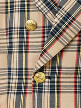 トレンド感のあるショート丈で、こなれた印象に仕上げてくれるテーラードジャケット。ダブルブレスト仕様、ブリティッシュなチェック柄に映えたゴールドのボタンが雰囲気抜群。共布のミニスカートとセットアップで着用いただけます。