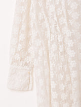 上品な花柄のレース生地で仕立てられた長袖ドレス。首の開いた襟元やキュッと絞ったカフスが、華やかなで女性らしい印象を与えてくれます。大胆な透け感で、様々なレイヤードコーディネートに馴染んでくれる一着です。