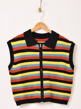 ポップなマルチボーダーが可愛い、襟付きジップアップのノースリーブニット。程よく肌を隠してくれるフレンチスリーブ風のデザインで、ざっくりとこなれた印象に着こなせます。やや厚みのあるアクリルニットです。