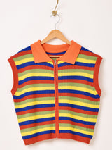 ポップなマルチボーダーが可愛い、襟付きジップアップのノースリーブニット。程よく肌を隠してくれるフレンチスリーブ風のデザインで、ざっくりとこなれた印象に着こなせます。やや厚みのあるアクリルニットです。