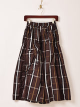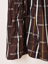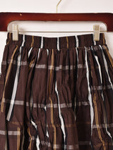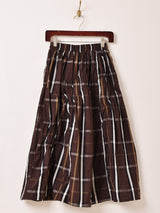 ランダムにシャーリング加工が施され、程よいボリューム感と動きのあるシルエットを楽しめるロングスカート。シックなブラウンチェックも魅力的です。シャカシャカとした生地感です。
