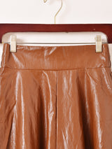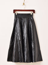 ふわっと広がるフレアシルエットに、フェイクレザーの質感がマッチして、甘辛ミックスな雰囲気抜群のスカート。絶妙なミモレ丈で、足元コーデを楽しみながら細見え効果でスタイルアップが叶います。