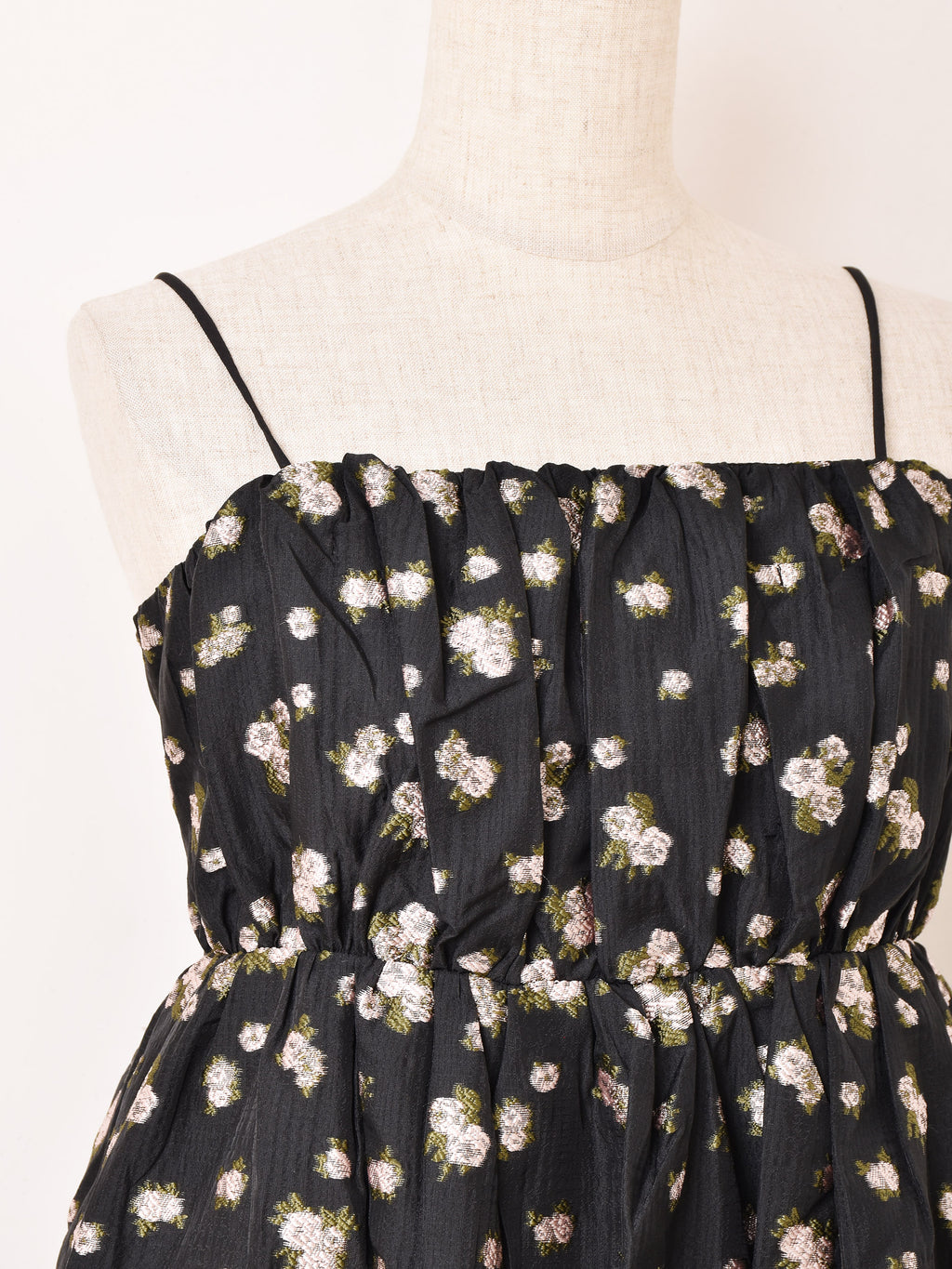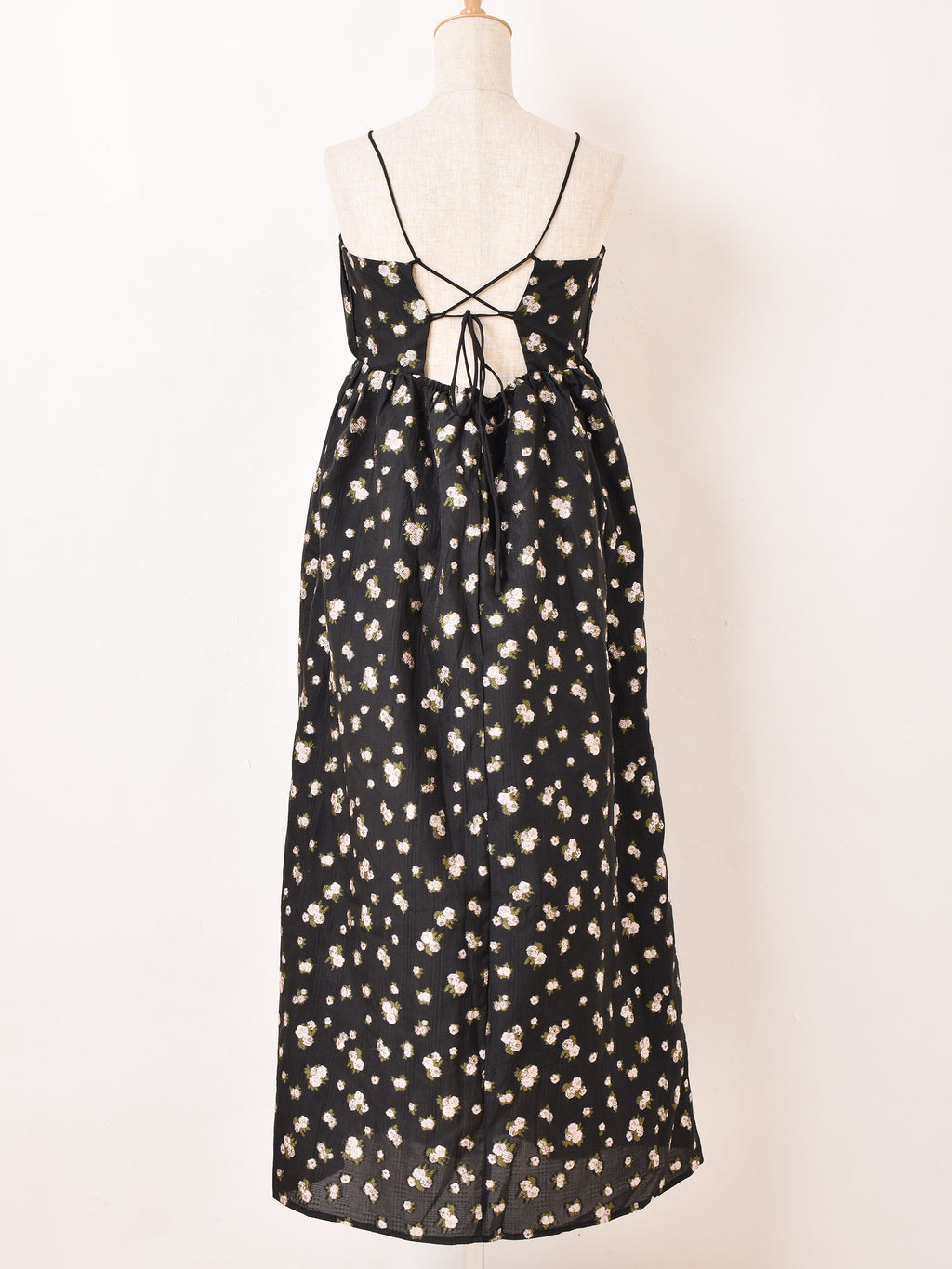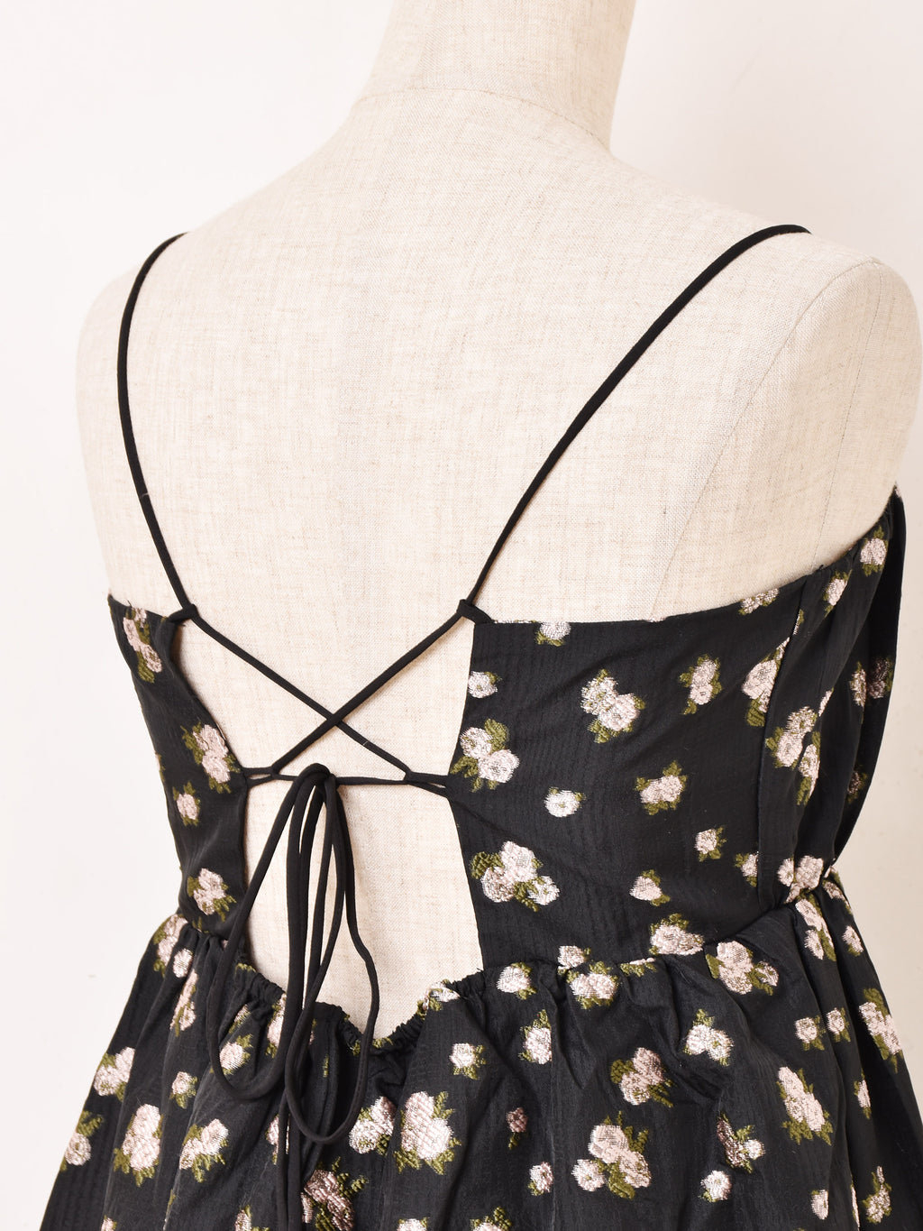 ジャガード織りの小花をあしらったキャミワンピ。華奢な肩紐は調節可能。ざっくりと開いた背中のデザインはレースアップになっており、よりバックスタイルが映える一着です。オールシーズンを通してレイヤードコーデが楽しめます。