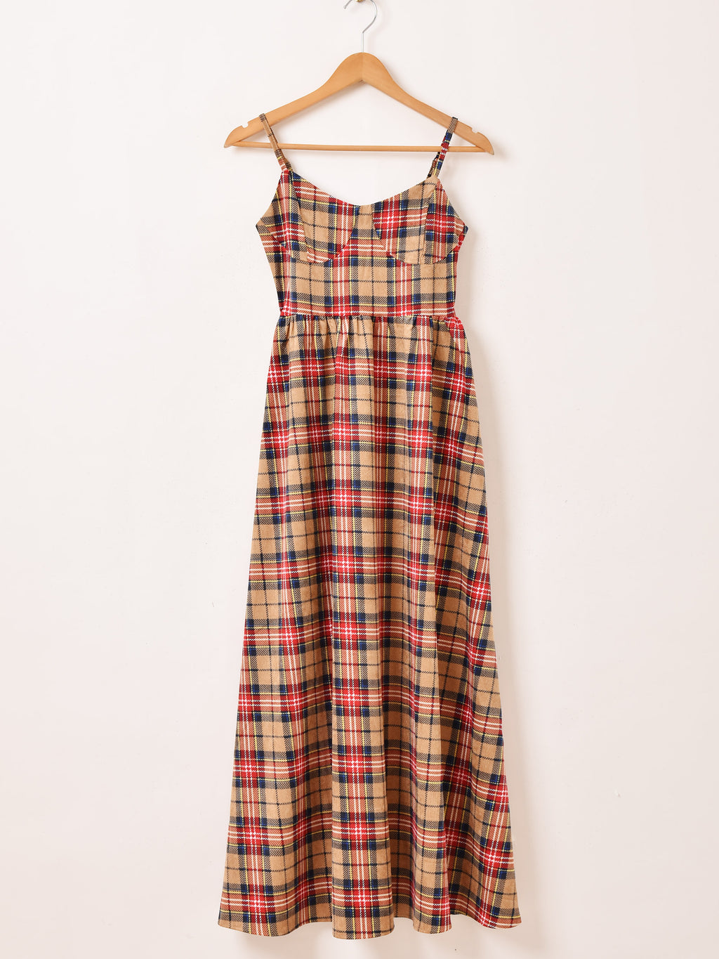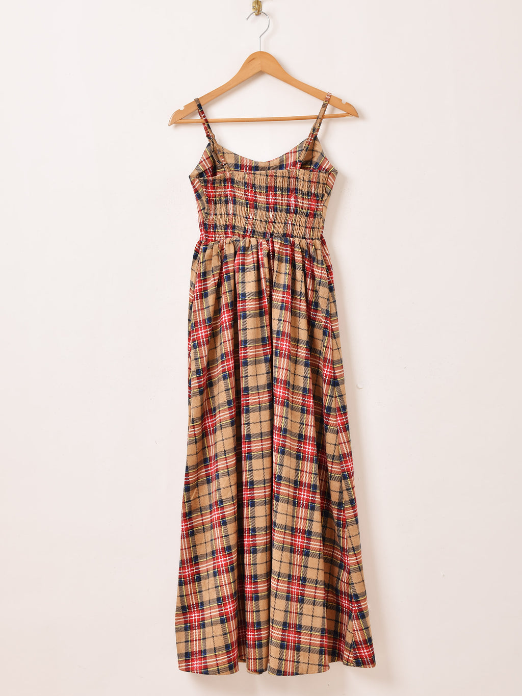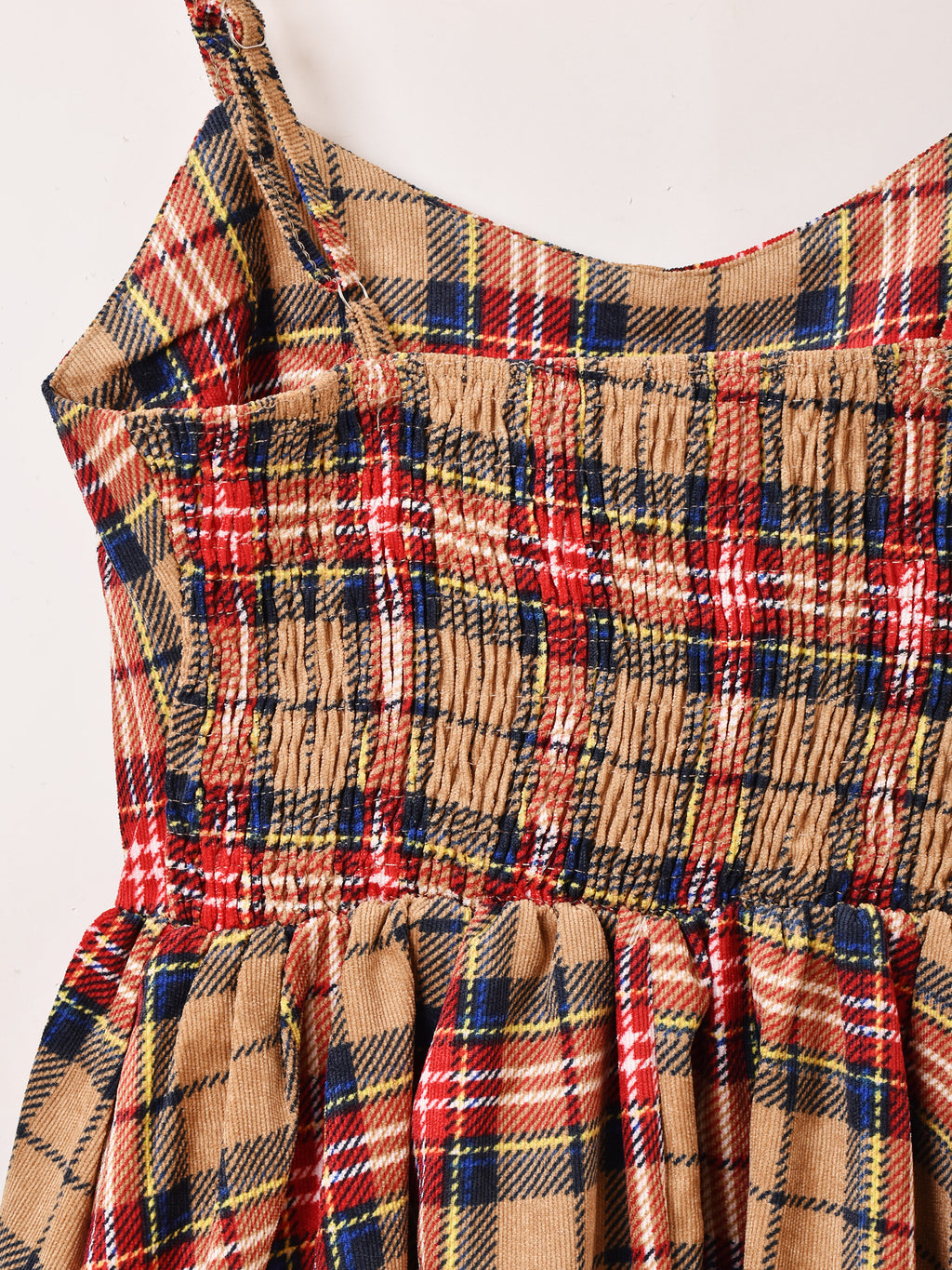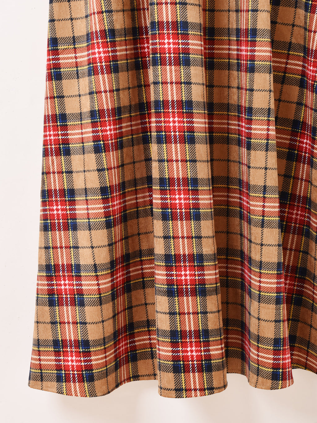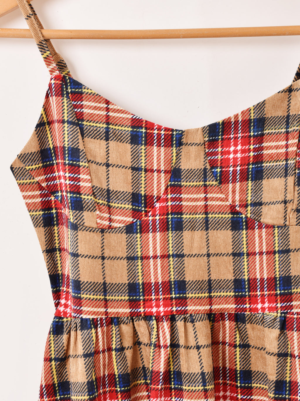 秋冬らしいコーデュロイのキャミワンピ。こちらはブリティッシュな雰囲気がおしゃれなチェック柄になります。マキシ丈にハイウエストなので、スタイル良く着こなせるシルエットがポイント。バックはシャーリング仕様で身体にフィットしてくれます。