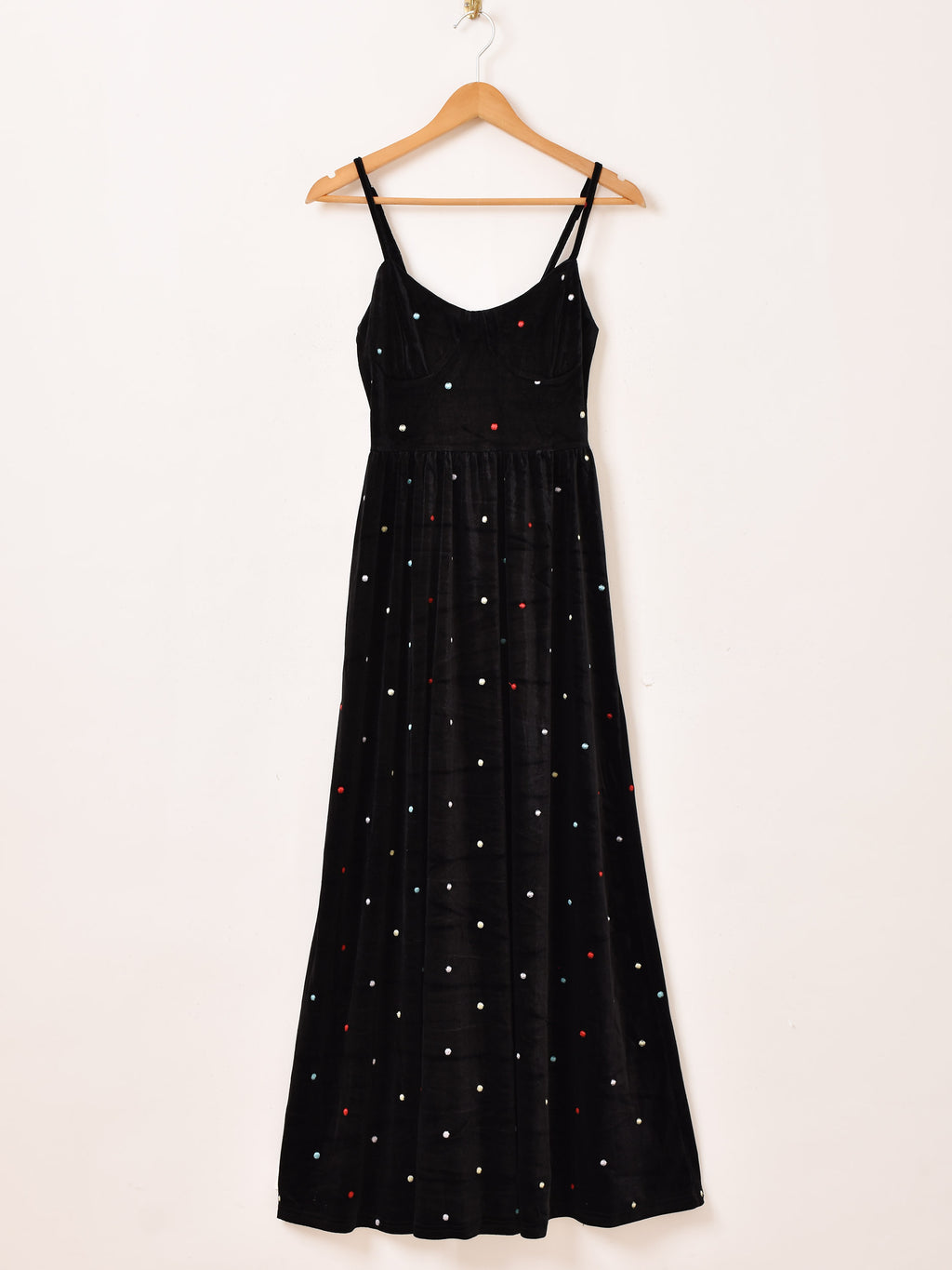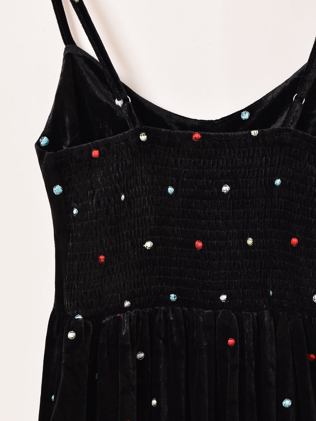 カラフルな水玉模様が刺繍されたキャミワンピ。マキシ丈にハイウエストなので、スタイル良く着こなせるシルエットがポイント。バックはシャーリング仕様で身体にフィットしてくれます。