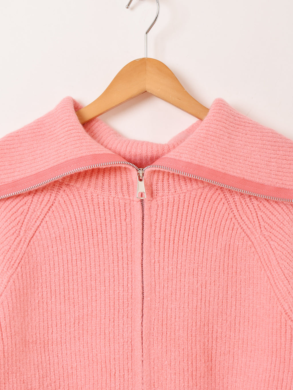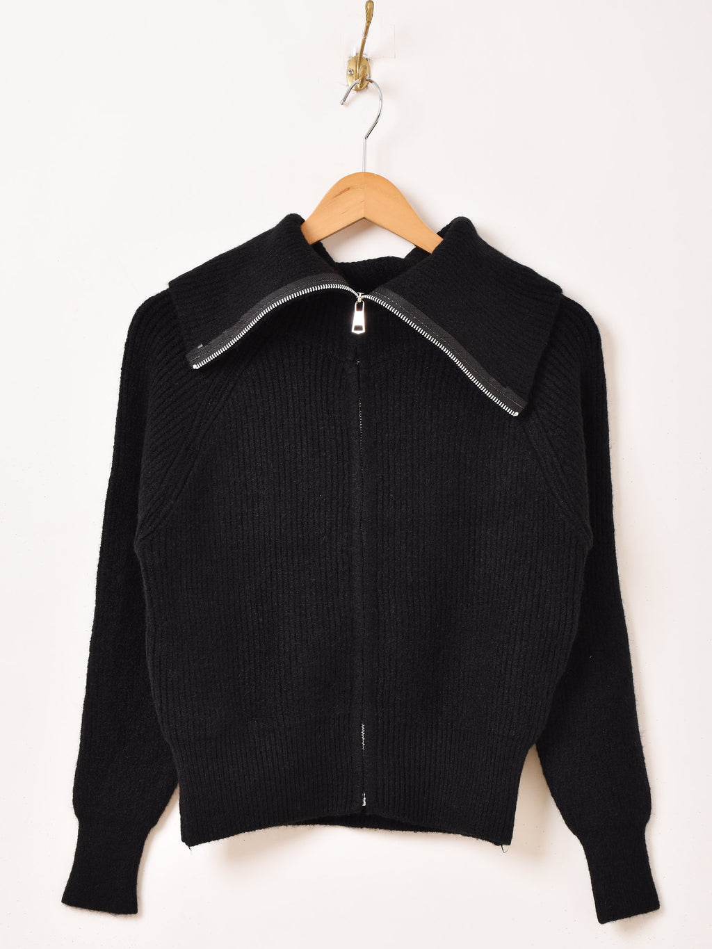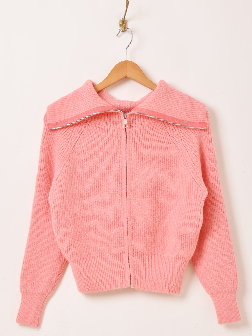 ジップアップデザインの大きな襟が可愛いカーディガン。シンプルなので様々なアイテムとも相性良く、コーディネートに馴染みやすい一着です。伸縮性のあるリブニットで、フィット感のある着こなしに。