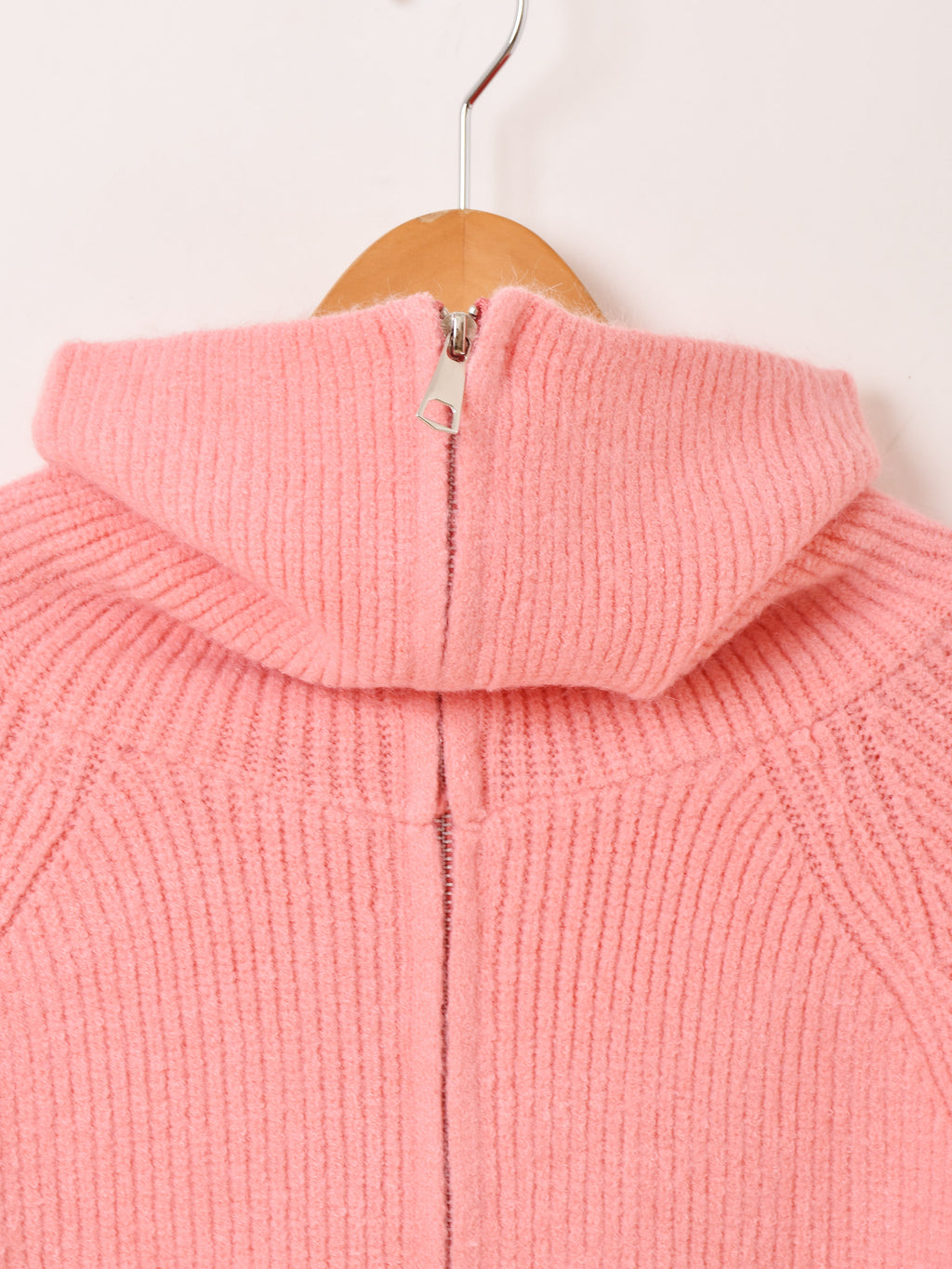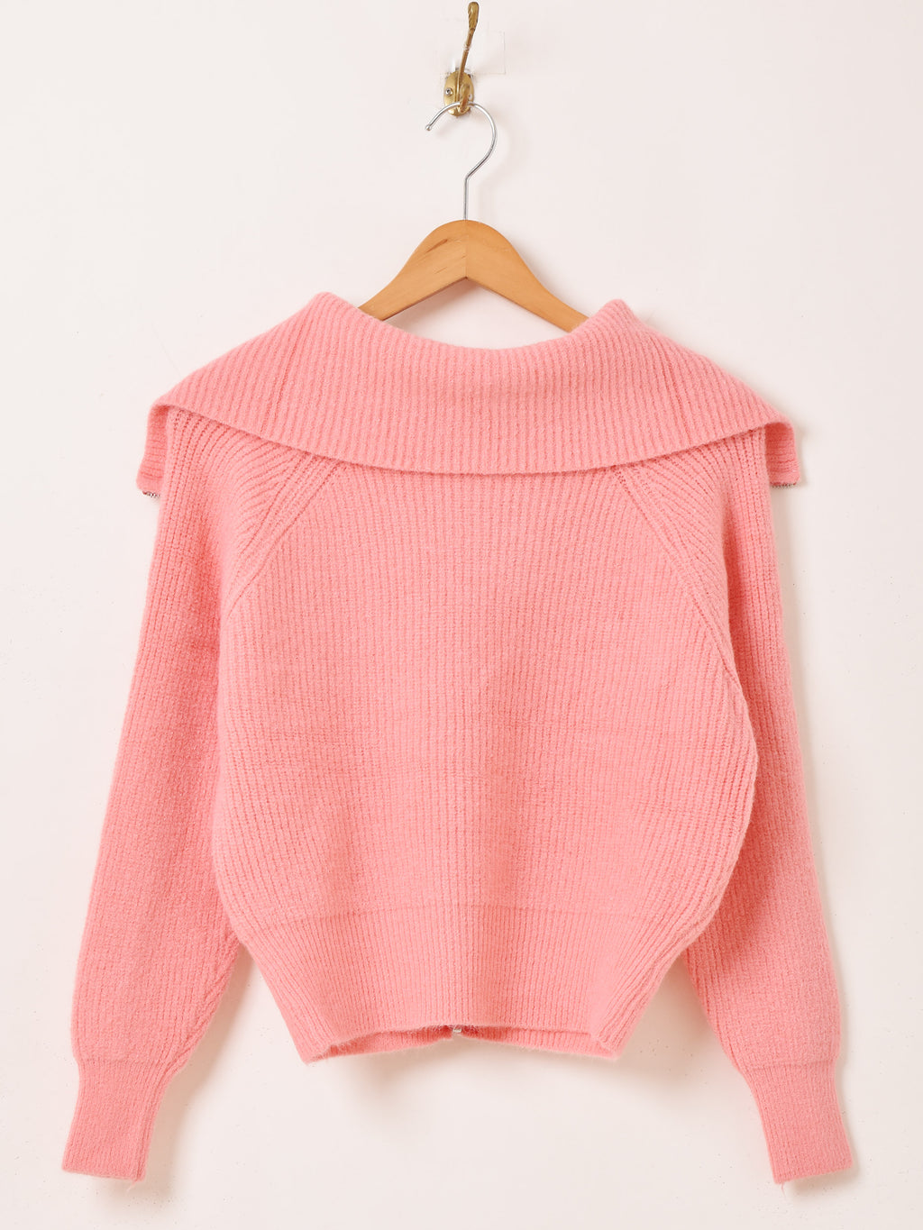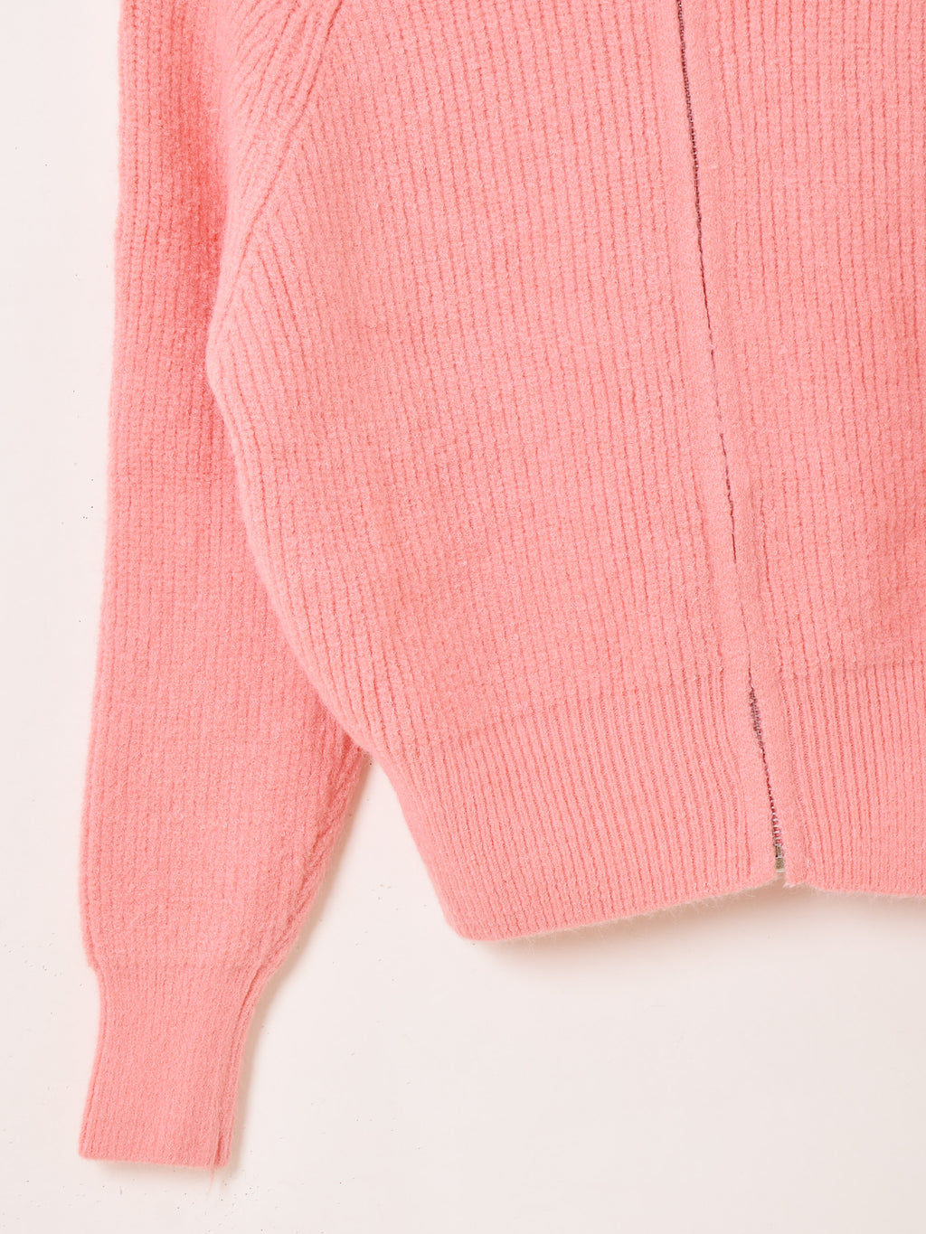 ジップアップデザインの大きな襟が可愛いカーディガン。シンプルなので様々なアイテムとも相性良く、コーディネートに馴染みやすい一着です。伸縮性のあるリブニットで、フィット感のある着こなしに。