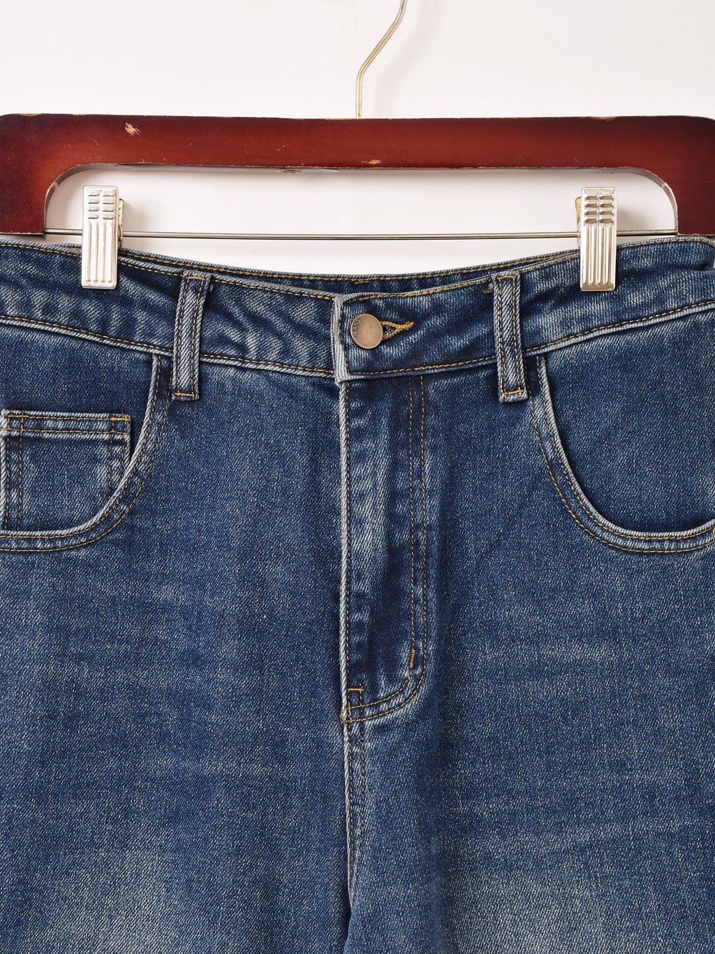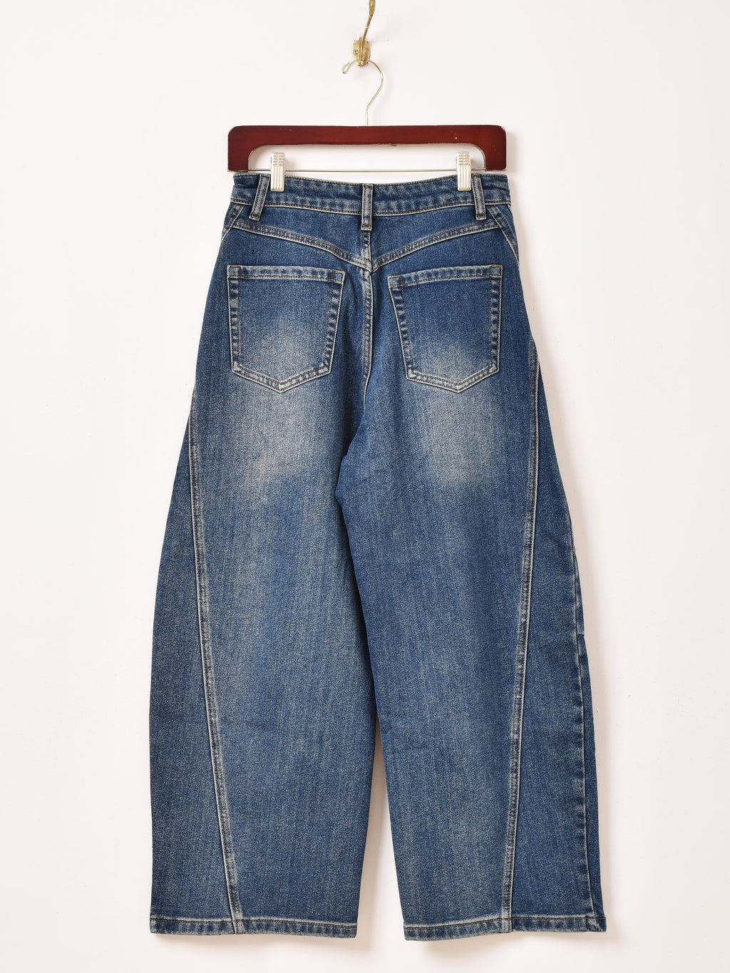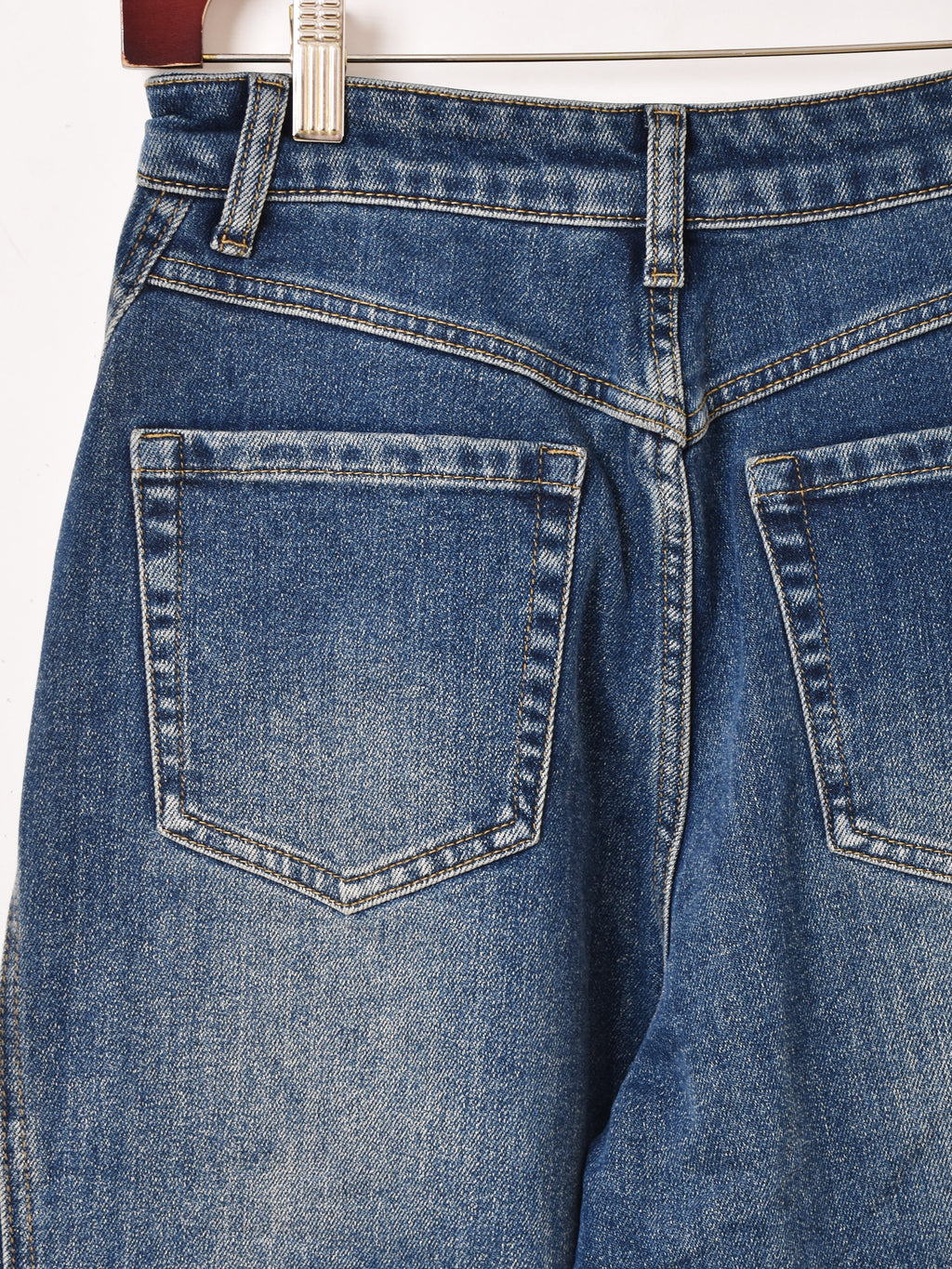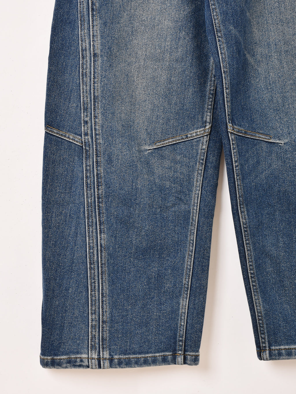 トレンド感のあるカーブシルエット×ハイウエストで、体型カバーしつつスタイルアップが叶う一着。膝横にカーブ感を出すためのダーツデザインが施されており、立体的なシルエットがポイント。ヴィンテージクラフトのようなデニム生地がこなれた印象に仕上げてくれます。