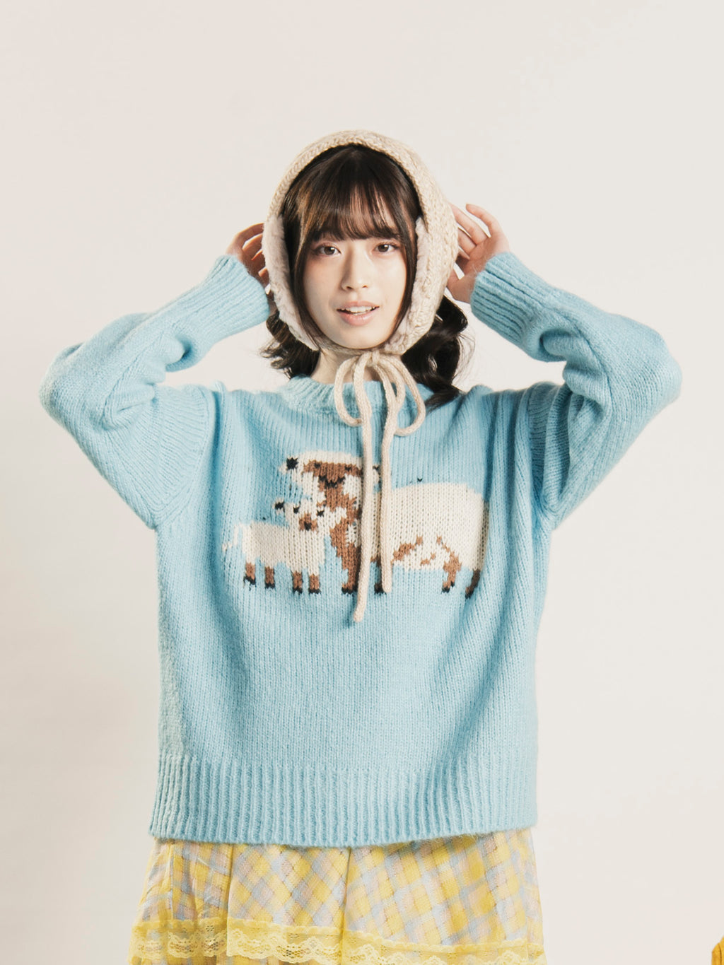 シュールな雰囲気の羊の親子がデザインされたセーター。1枚着るだけでもキュートでアクセントに。厚みのあるニット生地で仕立てた、季節感のある一着です。