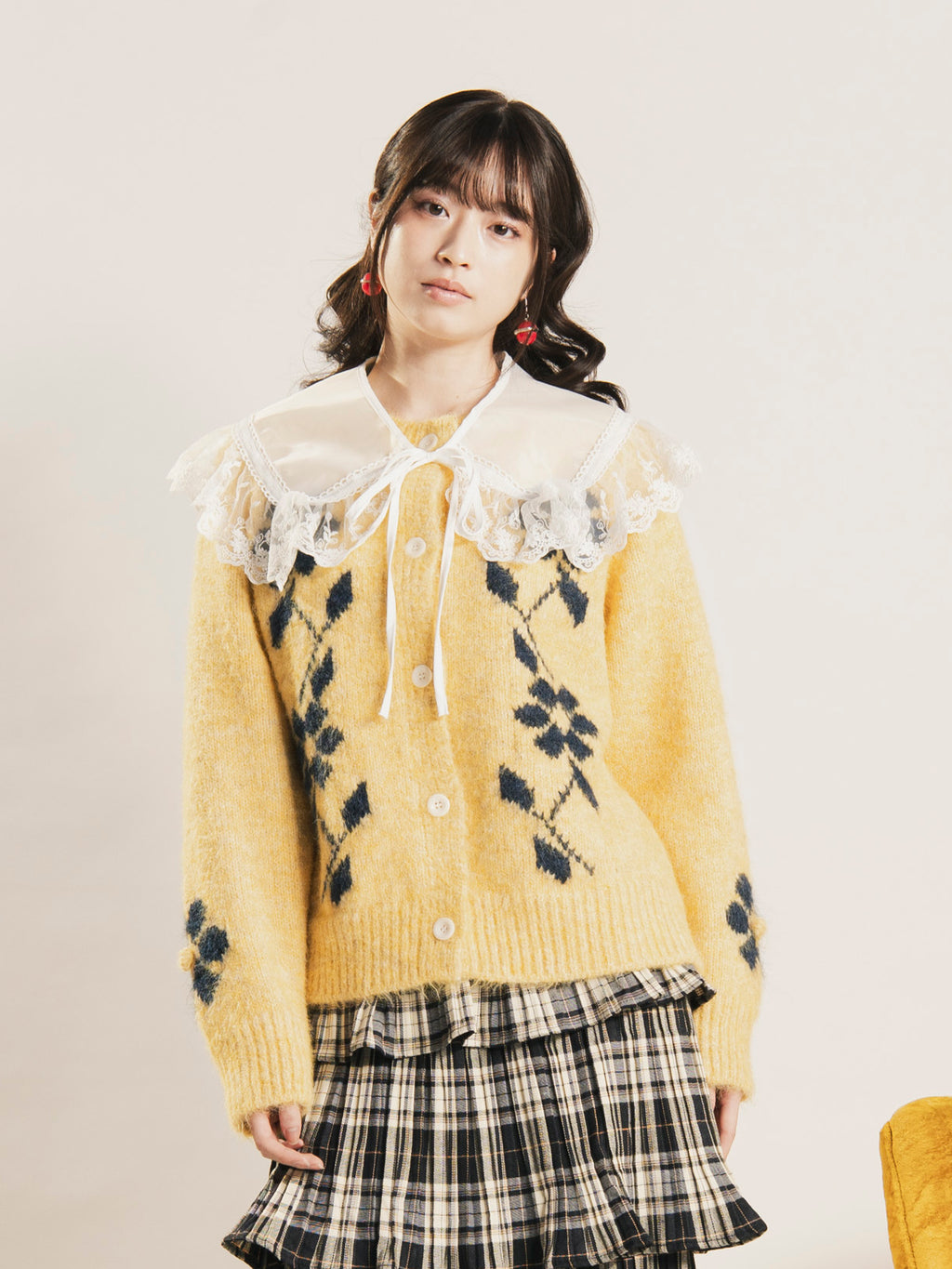 花のモチーフがデザインされたカーディガン。毛足の長く、あたたかなニット生地で仕立てた季節感溢れる一着です。