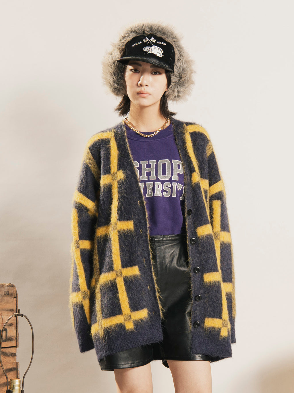 格子パターンで編まれたカーディガン。ふんわりとブラッシュド加工を施し、柔らかな肌触りが魅力的です。ゆるっと着こなせるオーバーサイズなのでメンズにもおすすめ。