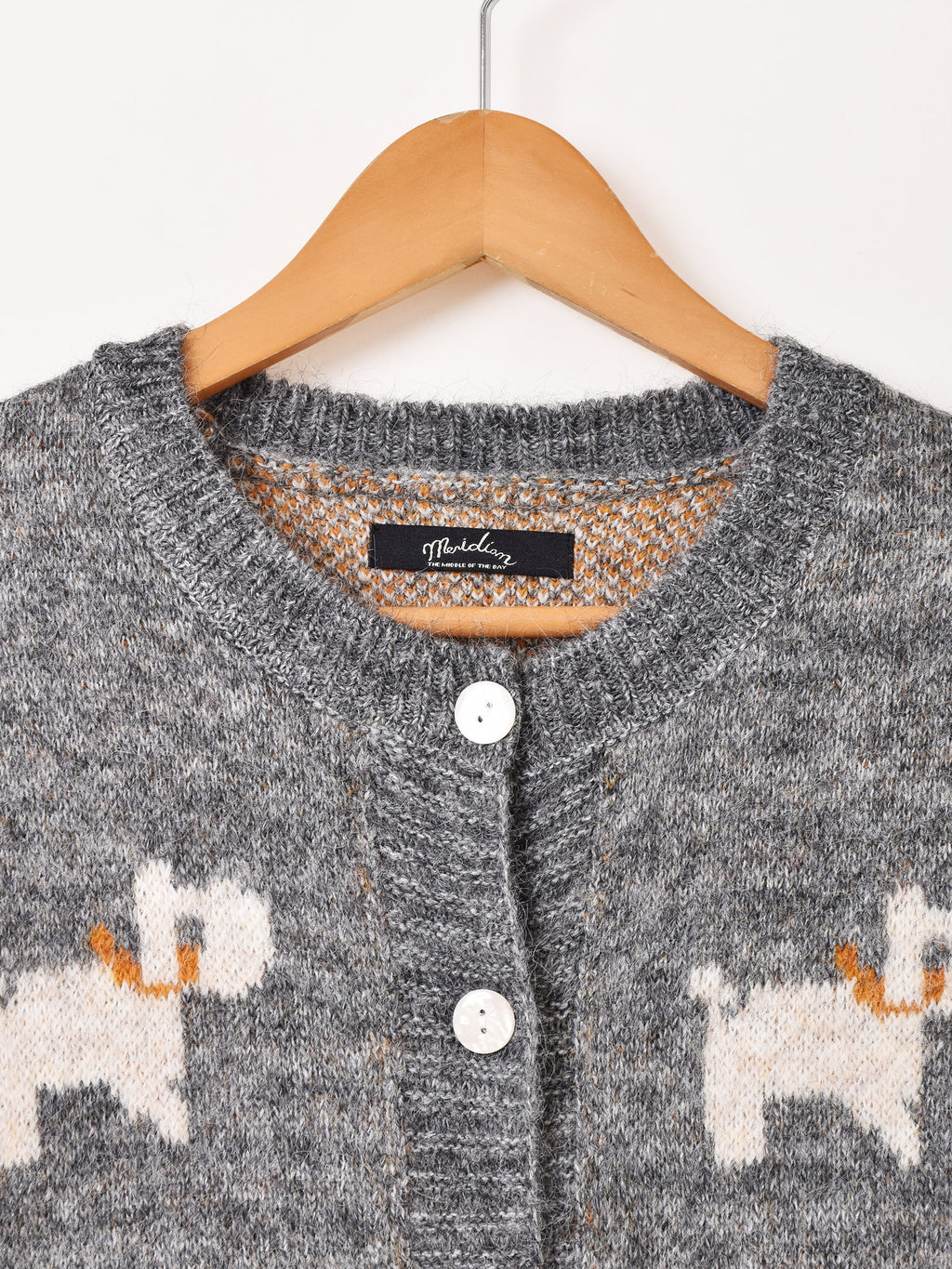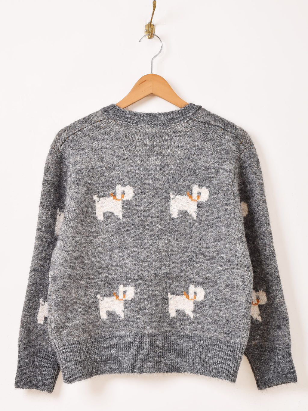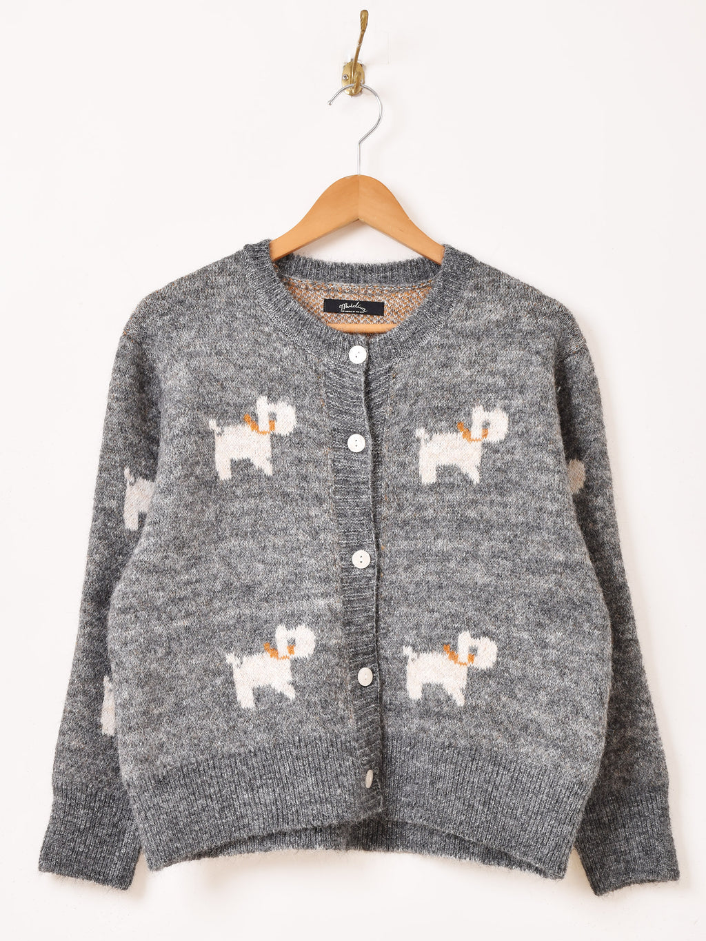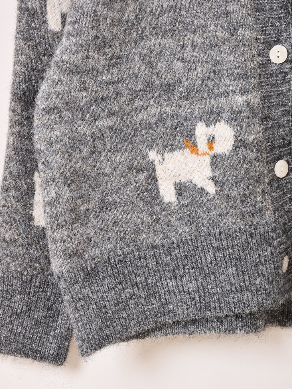 ワンちゃんの模様をあしらったカーディガン。程よくブラッシュド加工され、秋冬らしいあたたかみのある生地感です。