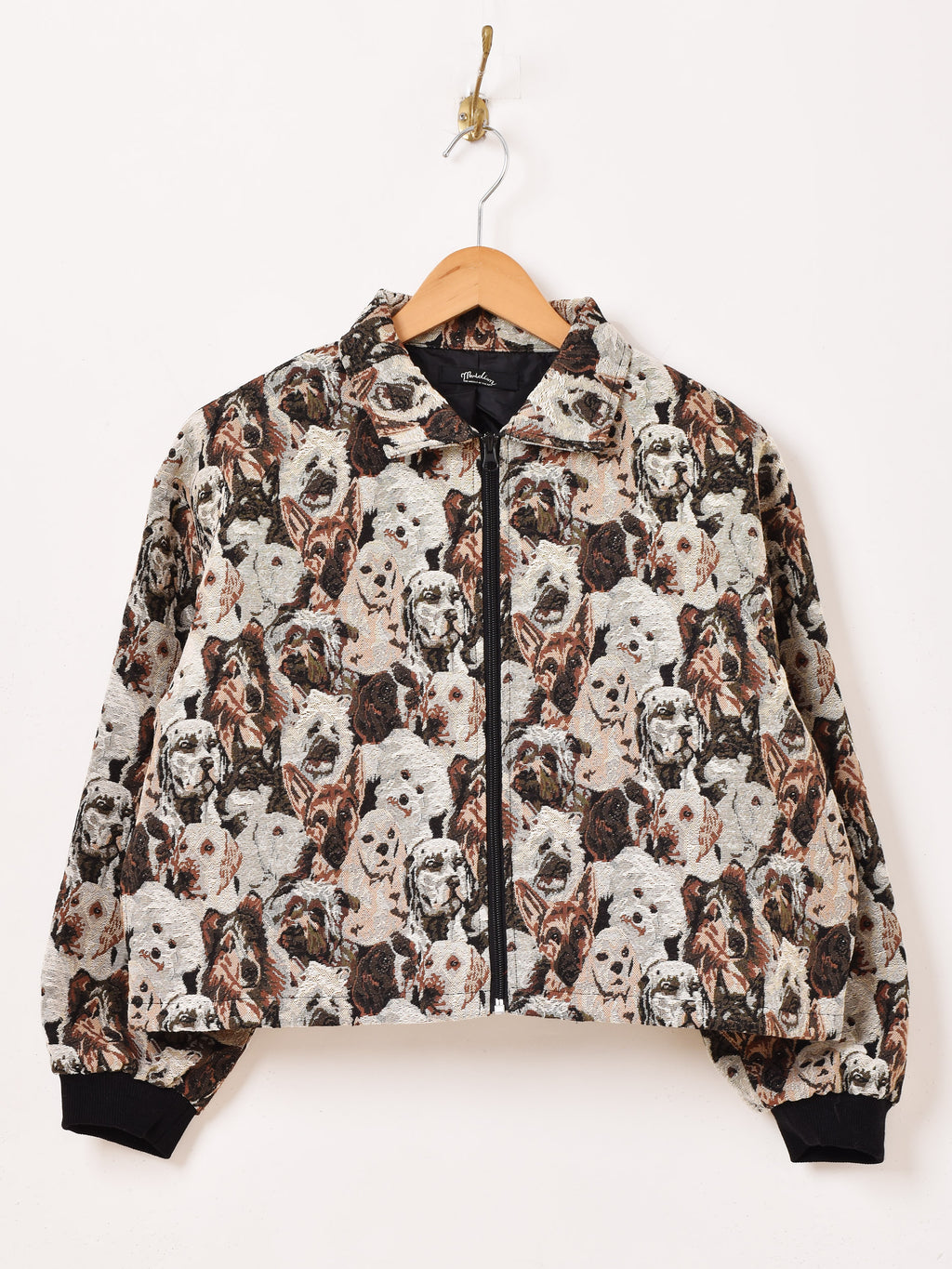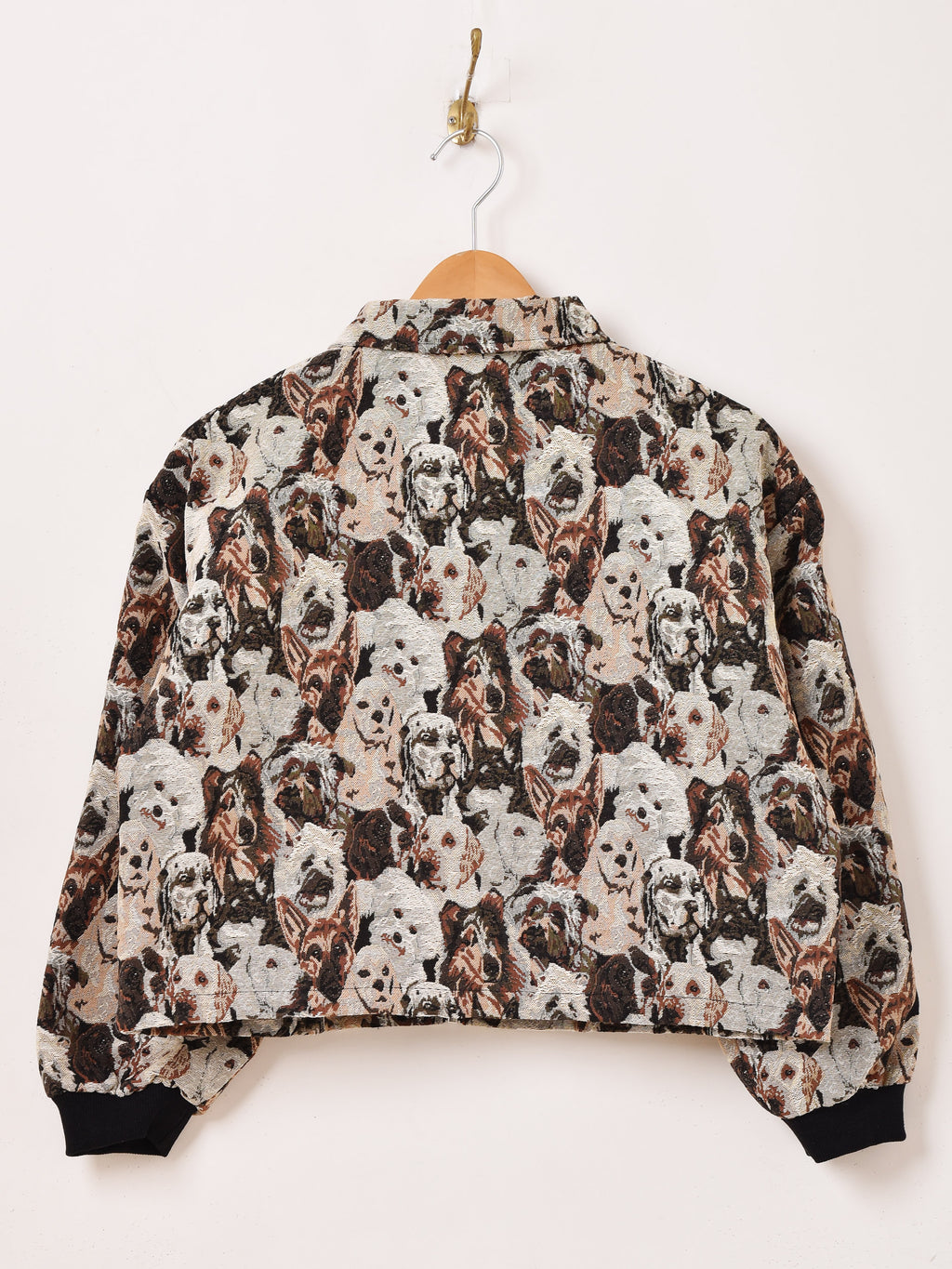 たくさんの可愛らしいワンちゃんたちの模様が目を惹くジャケット。アンティークな雰囲気が魅力的な一着。クロップド丈でバランス良く着こなせるので、スタイルアップも叶います。