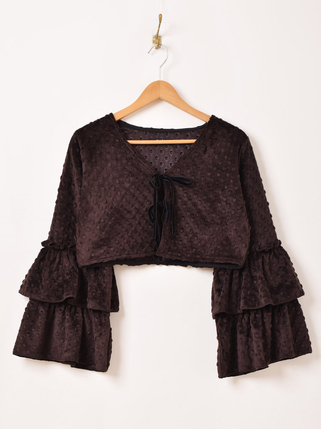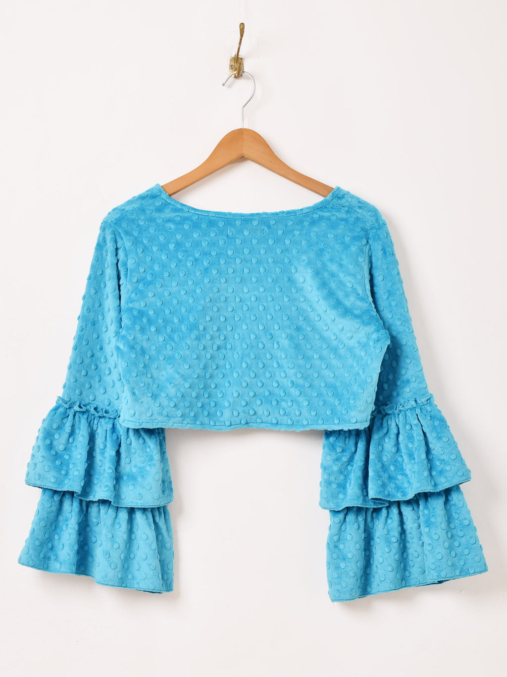 袖の2段ラッフルがアクセントになった長袖ブラウス。滑らかなソフトファー生地で、シーズンムードたっぷりの一着。クロップド丈でスタイルよく着こなせて、レイヤードファッションにおすすめ。コーディネートを華やかにしてくれます。