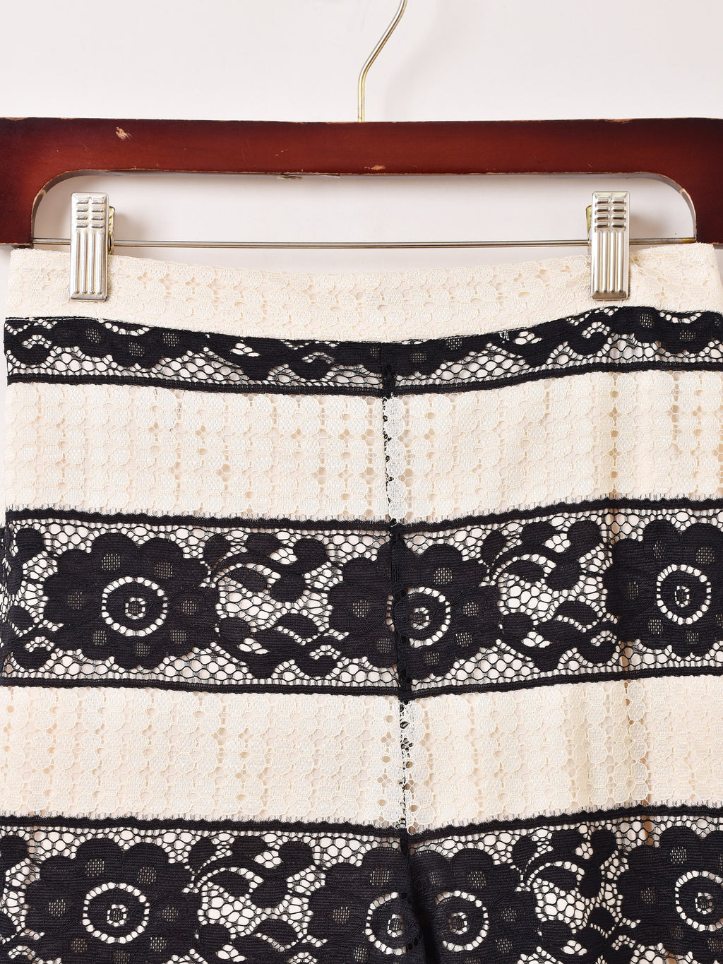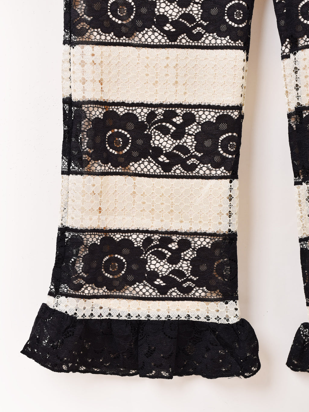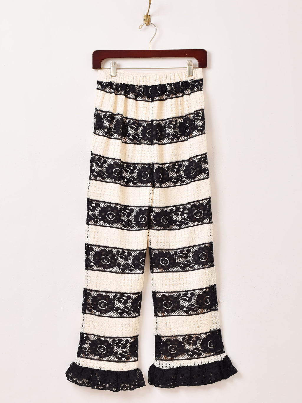 エレガントなレース生地をまとった、ボーダーデザインのロングパンツ。裾はフリルになっており、程よくフレアなシルエットがすっきりと着こなせます。コーデの主役にもぴったりの一着です。