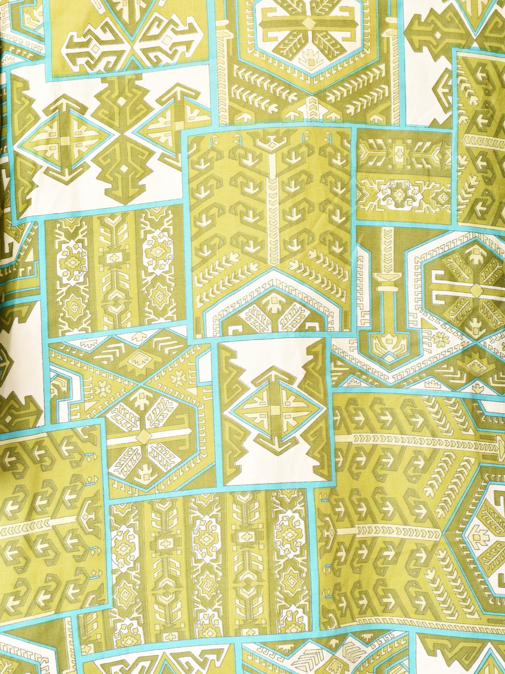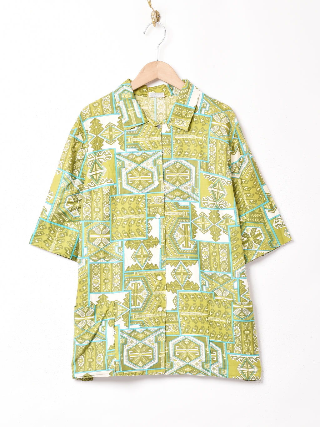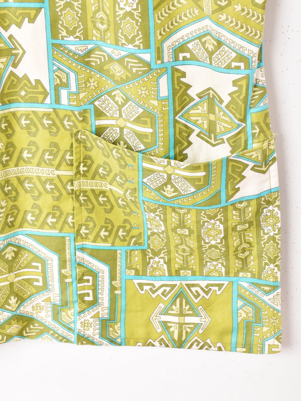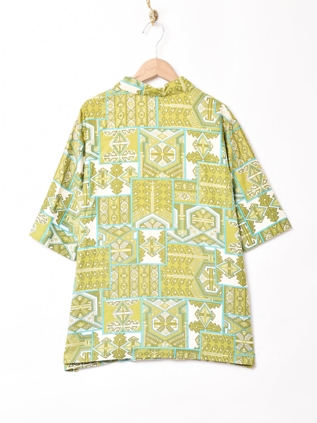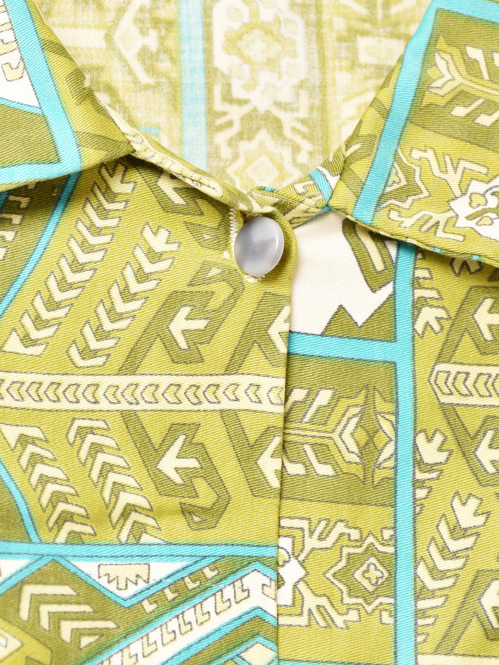 主役級の大胆な模様が魅力的な半袖シャツ。両サイドにあしらった大きなポケットがポイント。おそらくポリエステル素材で、程よく厚みのあるしっかりとした生地感です。
