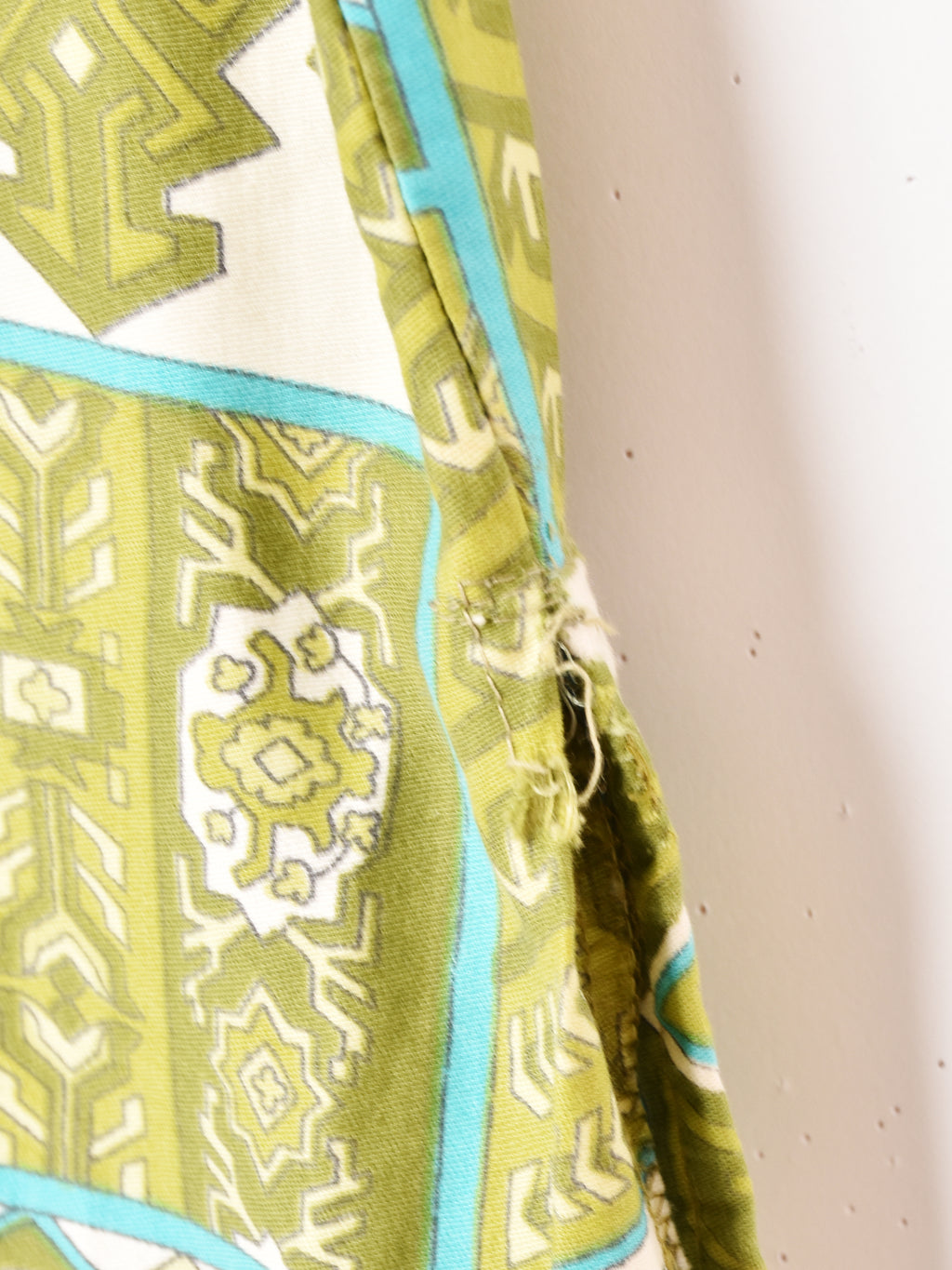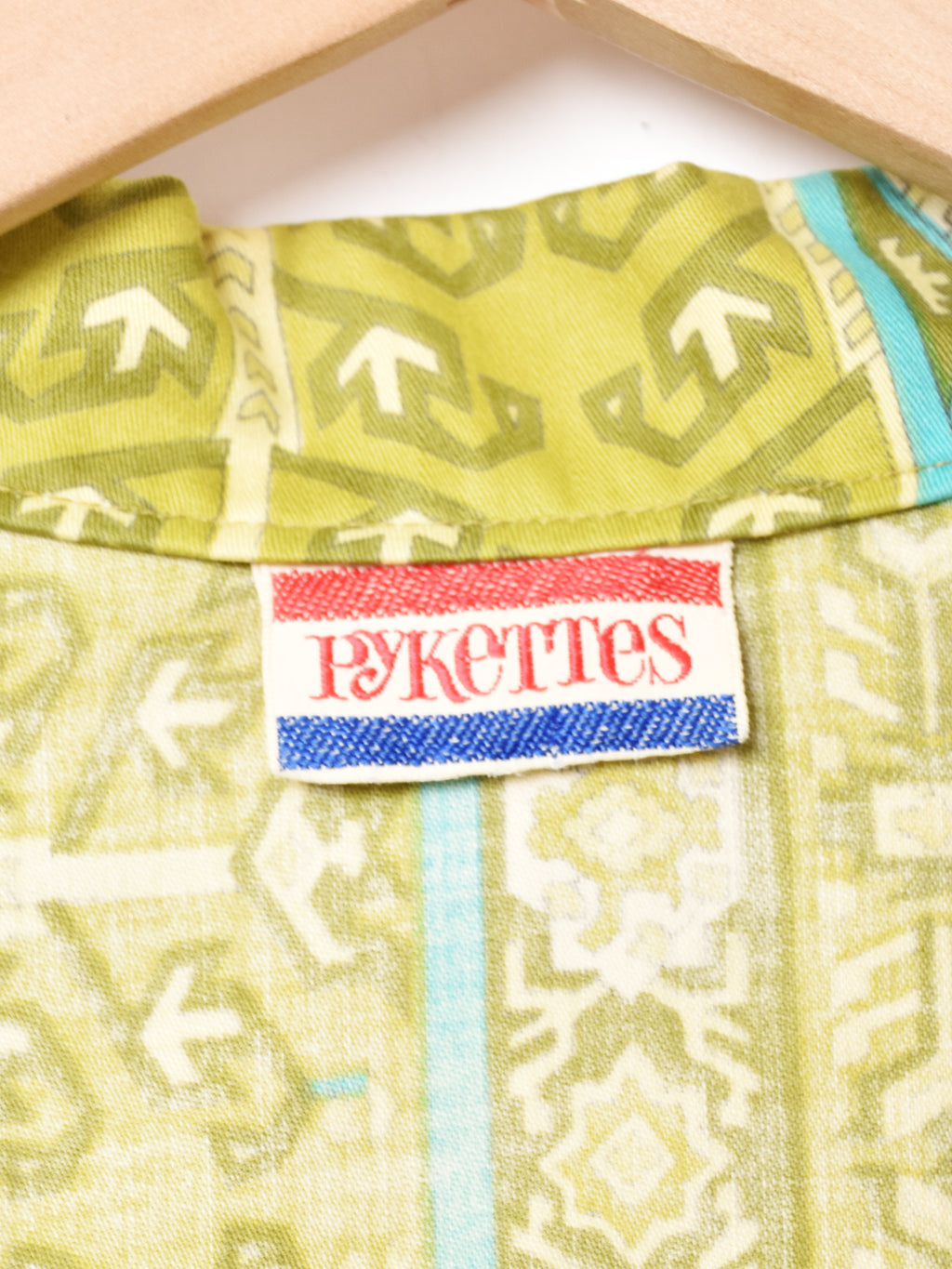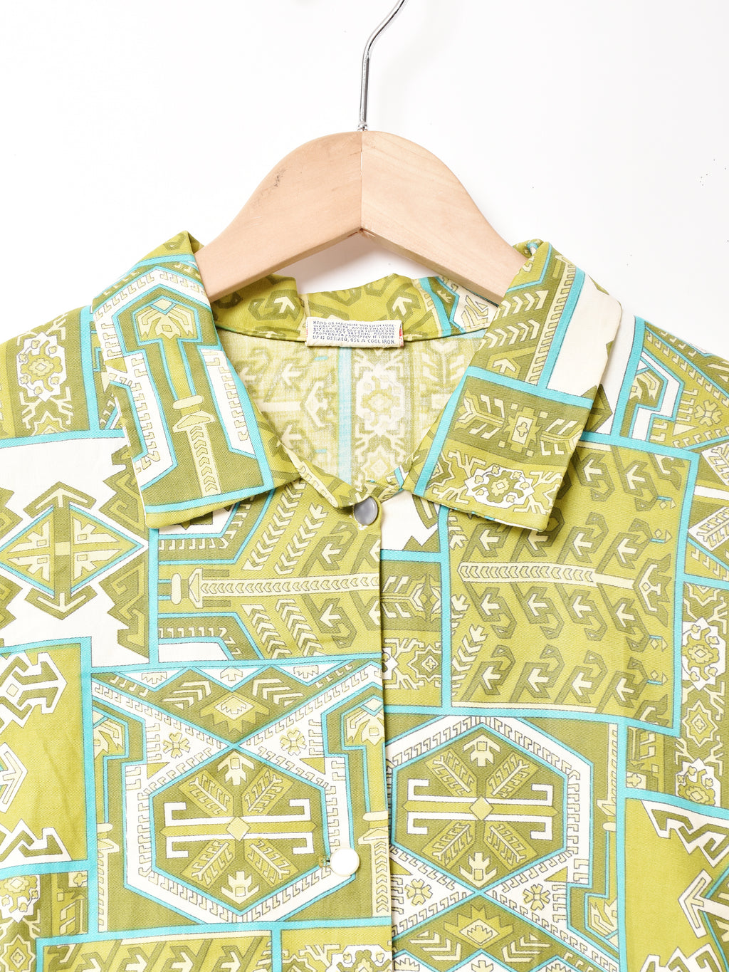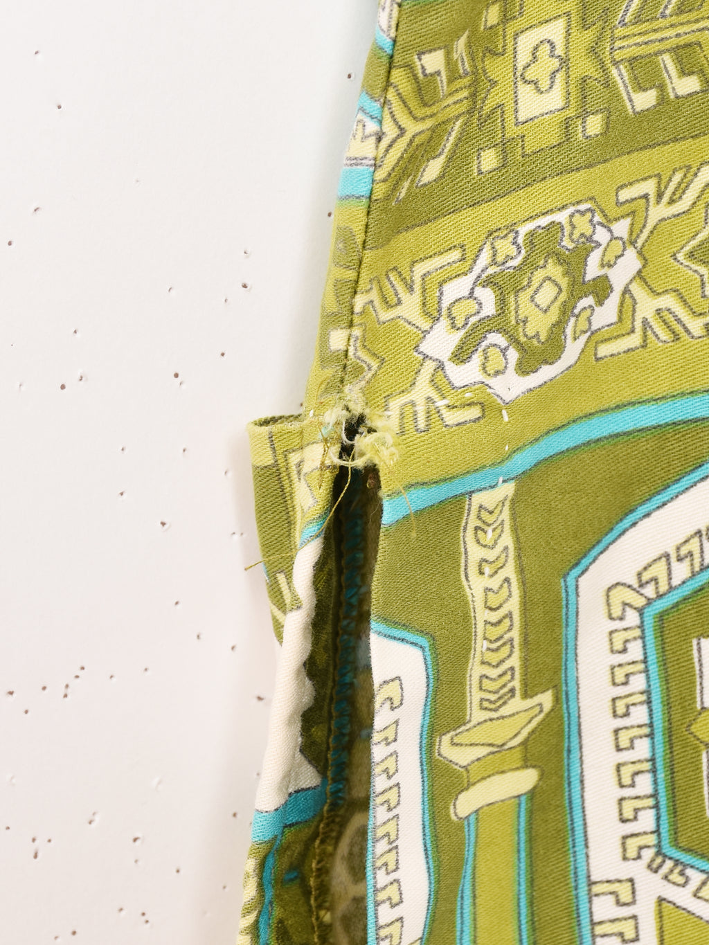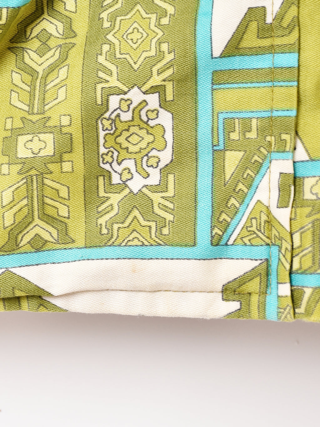 主役級の大胆な模様が魅力的な半袖シャツ。両サイドにあしらった大きなポケットがポイント。おそらくポリエステル素材で、程よく厚みのあるしっかりとした生地感です。