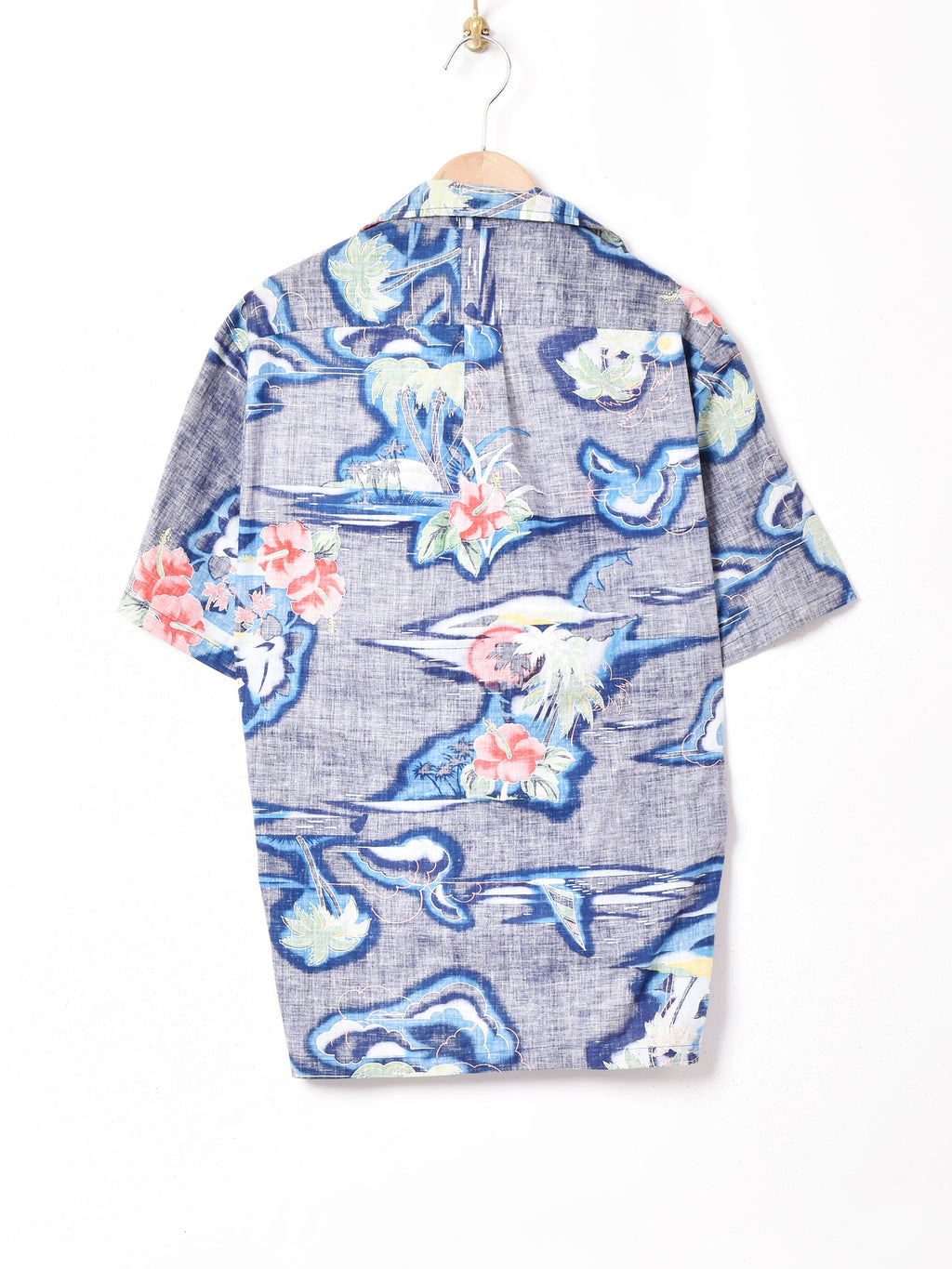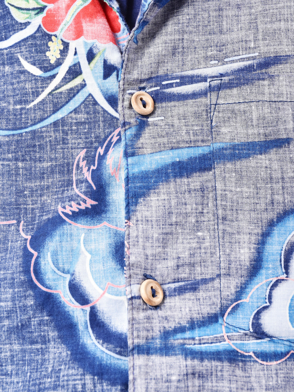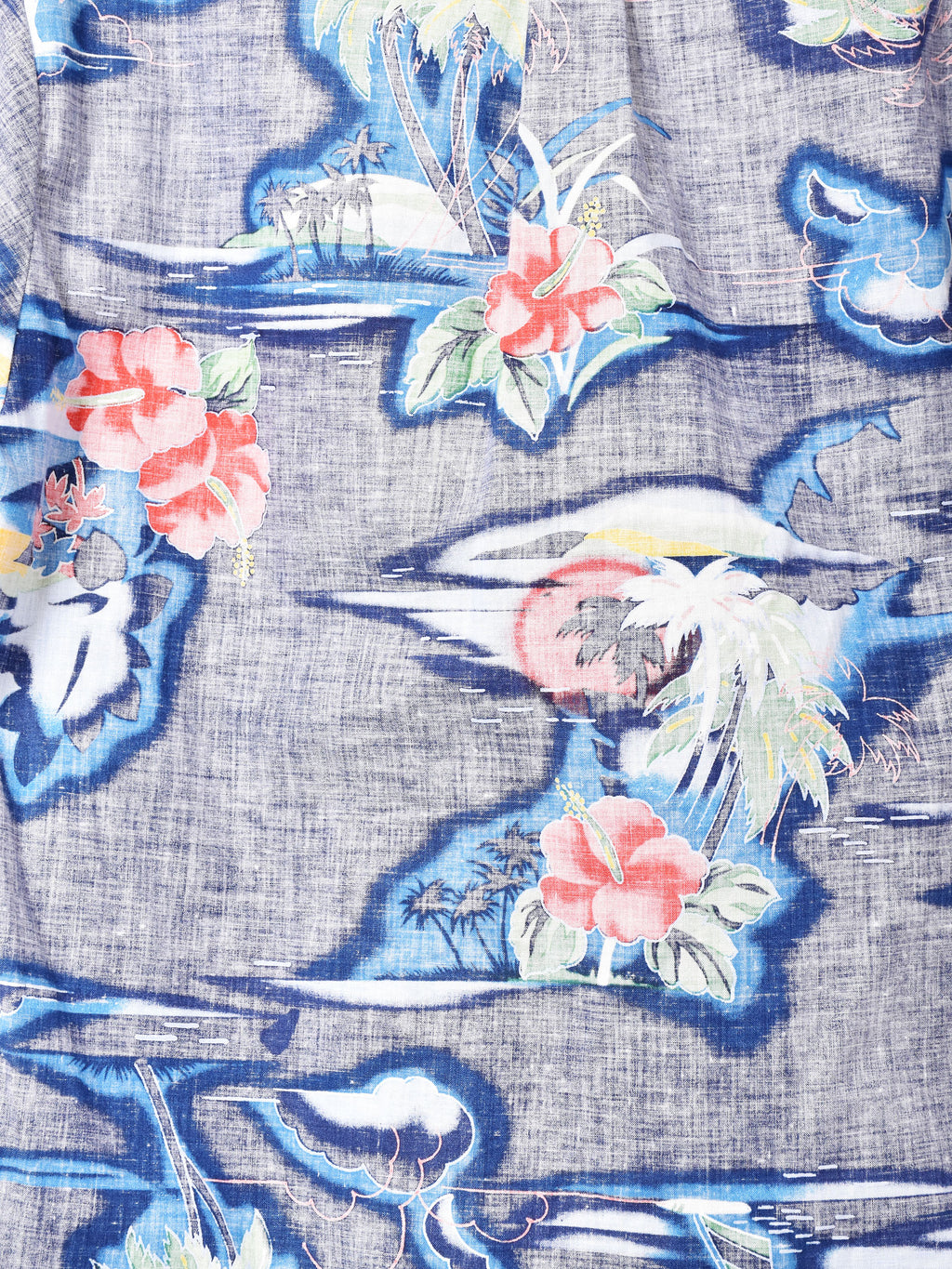 ぼんやりと柄が浮かび上がる裏返しデザインが洒落ているアロハシャツ。ユニークなデザインがお好みの方にオススメの一点。おそらくコットン素材のさっぱりとした生地感です。